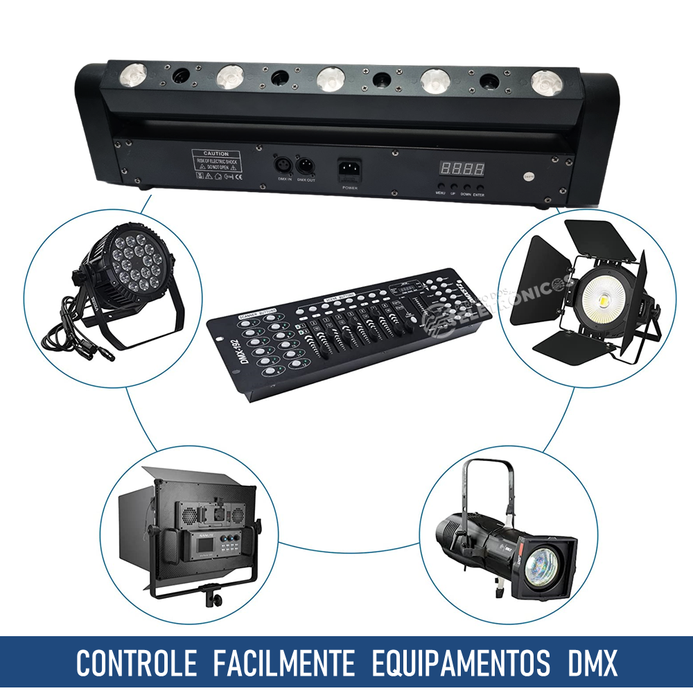 Observação importante: Para ligar o equipamento de iluminação à mesa DMX, é necessário utilizar cabos DMX. A luminária não acompanha cabo DMX. A mesa DMX acompanha 1 cabo DMX de 1 metro.