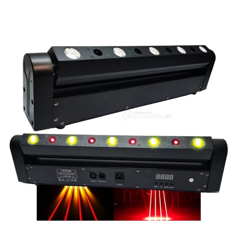 Laser nas cores vermelho e amarelo âmbar, com movimento de cabeça de 180 graus, ideal para palco, festa, DJ, balada e discoteca. Possui formato borboleta, com variações de efeitos, iluminação de alta qualidade e alto brilho. Conta com 5 LEDs na cor amarelo âmbar, mais 4 LEDs laser na cor vermelhos, oferecendo diversas variações e combinações de efeitos.