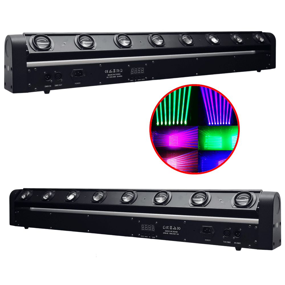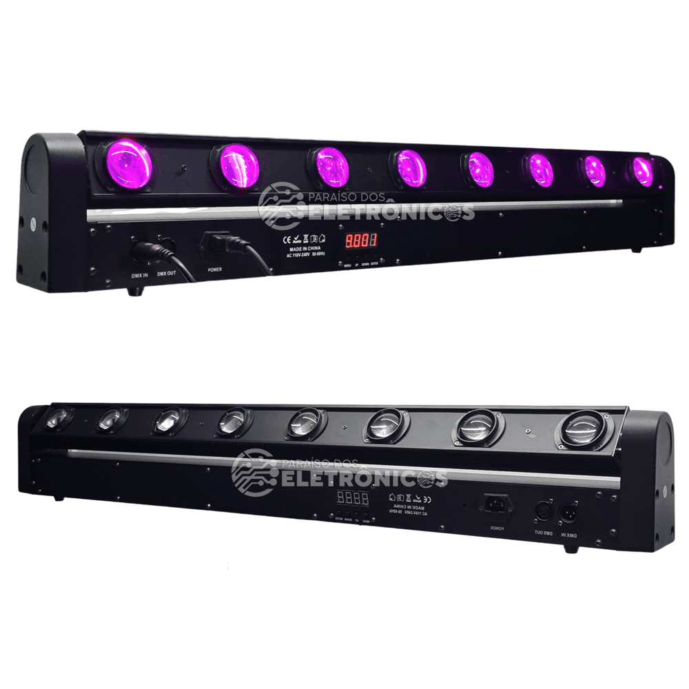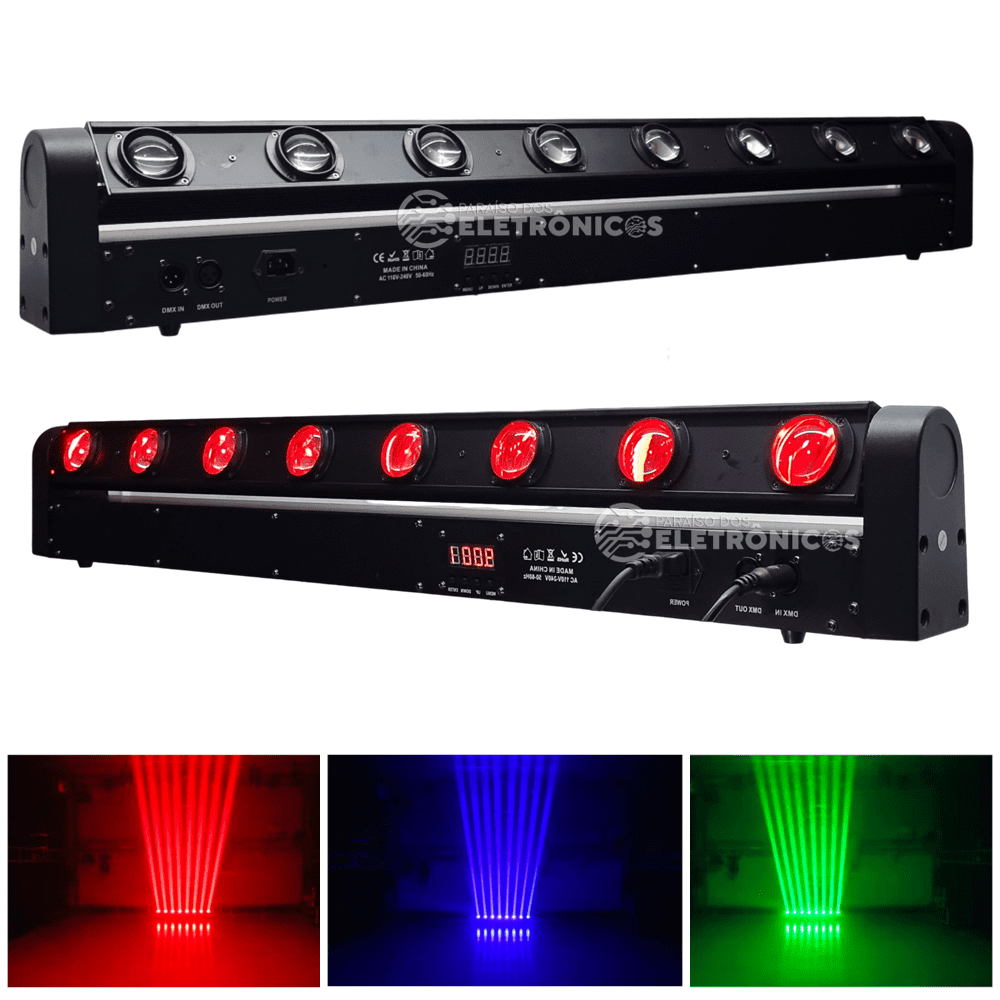 Iluminação Profissional barra 8 LED com movimento de cabeça 180g para palco festa DJ balada discoteca formato borboleta com variações de efeito iluminação de alta qualidade e de alto brilho colorido cores Azul, Verde, Vermelho, Branco, com mais variações e mistura de cores que pode ser usada.