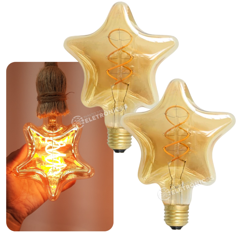 Linda lâmpada em LED formato Estrela. As lâmpadas de filamento de LED são modelos voltados totalmente para decoração. Com elas, você não precisa nem do uso de uma luminária para dar um toque especial, pois a graça está na própria lâmpada e seus filamentos de vários formatos diferentes, que ficam visíveis dentro do bulbo de vidro, quando acesa trazem ao ambiente uma luz alaranjada bem aconchegante.