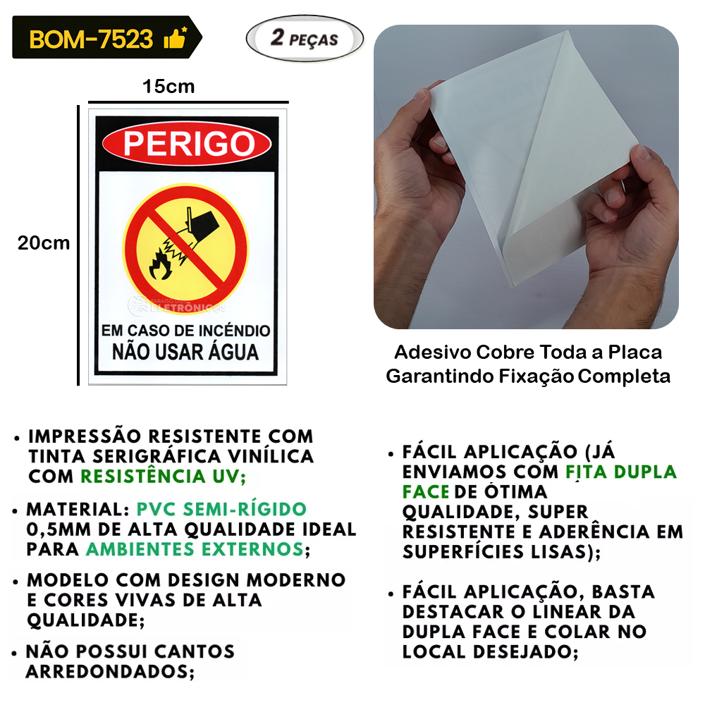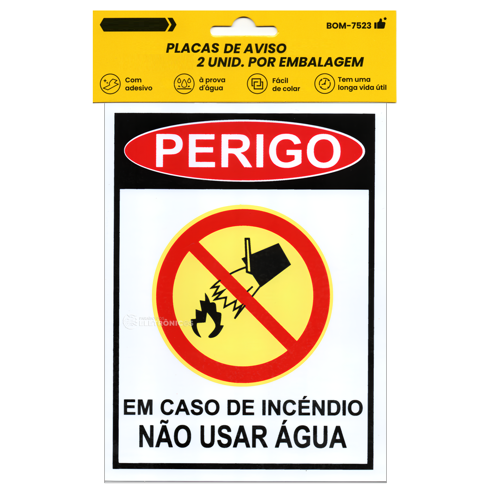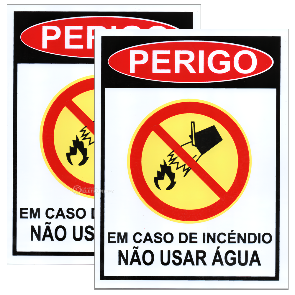 Kit 2 Placas Aviso de Perigo “Em Caso de Incêndio Não Usar Água” 20cm x 15cm – BOM7523