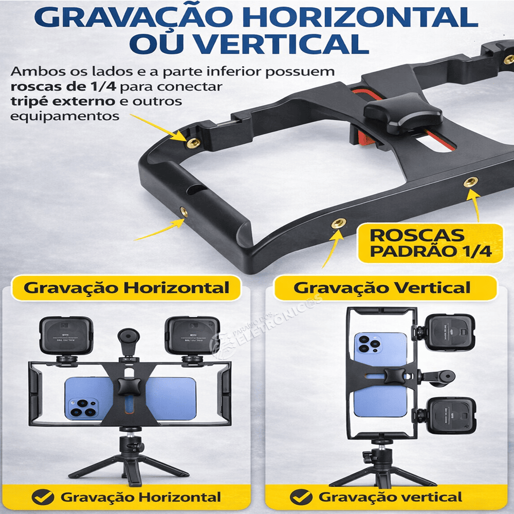 O suporte universal mantém o celular firme e seguro, permitindo gravações na horizontal ou vertical. Seu sistema com múltiplas roscas padrão 1/4 possibilita conectar acessórios adicionais como tripés, suportes e outros equipamentos. O design aberto também facilita o acesso aos botões do aparelho, garantindo total controle durante as gravações.