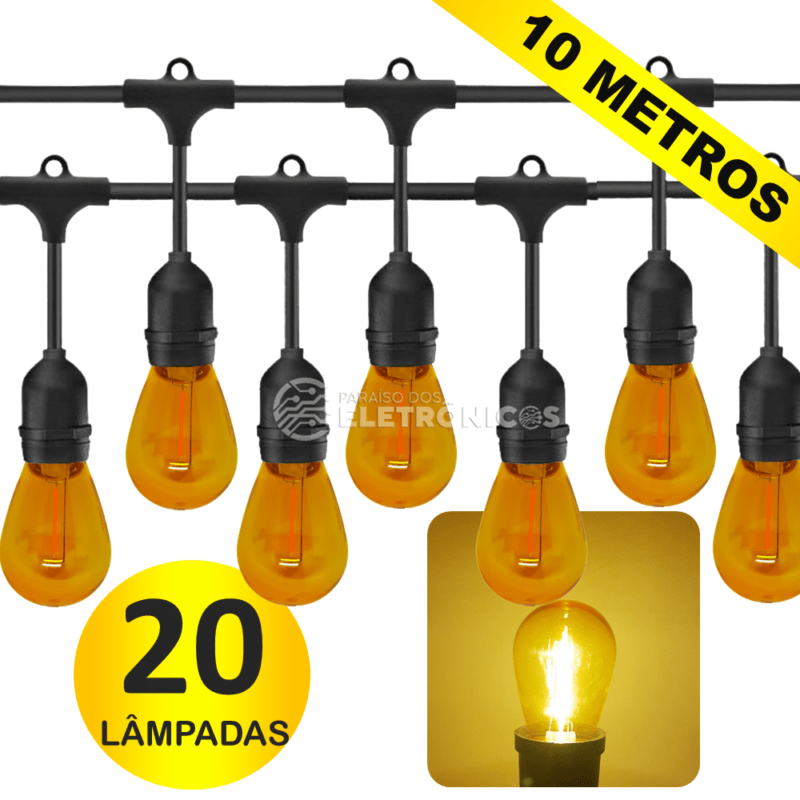 Kit Varal Iluminado Com 20 Lâmpadas LED S14 Retrô Econômica 1W 110v 10 Metros Amarelo – KIT023