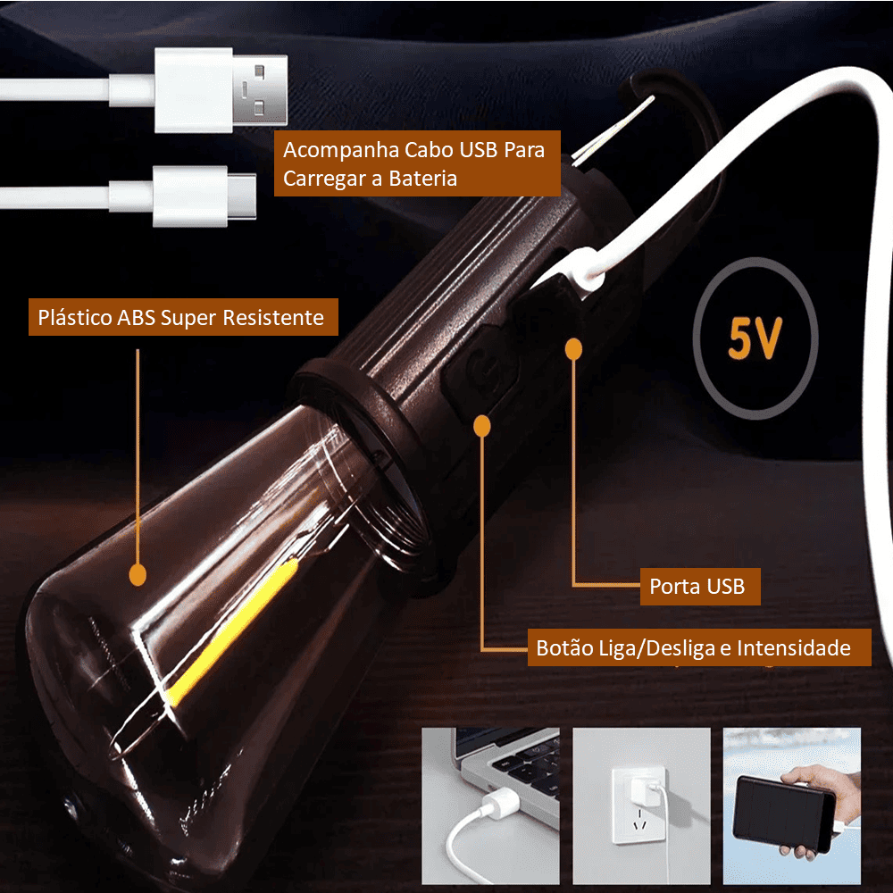 Este modelo é recarregável, o que significa que você pode utilizá-la repetidamente sem se preocupar com a troca de baterias. A lâmpada é alimentada por um cabo tipo C, facilitando o carregamento em qualquer lugar. Produto a prova d’água, sua durabilidade e eficiência a tornam uma companheira confiável para suas atividades ao ar livre. Acompanha cabo USB-C para recarrega-la em qualquer tomada 5v como por exemplo carregadores de celular. Possui botão liga desliga que também controla a intensidade da luz (forte ou fraca) além de ter o modo pisca, ideal para pedidos de SOS.