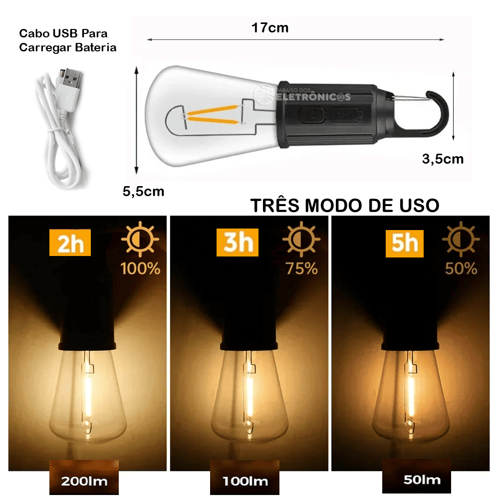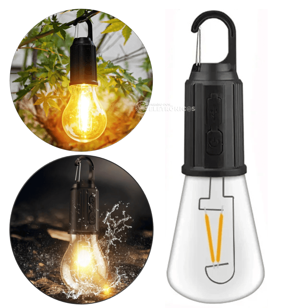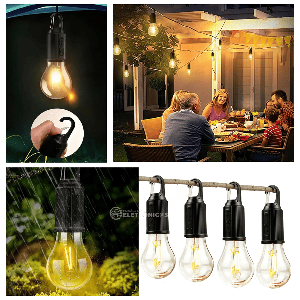 A Lâmpada Recarregável para barraca de acampamento e pesca é a solução ideal para suas aventuras ao ar livre. Com um design prático e funcional, esta lâmpada proporciona uma iluminação eficiente, permitindo que você desfrute de momentos agradáveis em meio à natureza. Seu tipo de luz LED amarela cria uma atmosfera acolhedora, perfeita para acampamentos e pescarias, mas também pode ser utilizado para decoração de festas, casamentos, jantares, etc. Possui um engate de pressão o que o torno útil podendo ser pendurado em qualquer local como varal, galhos de árvores, hastes de barracas, etc.