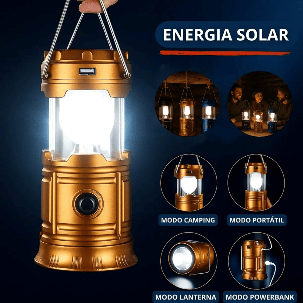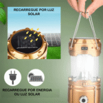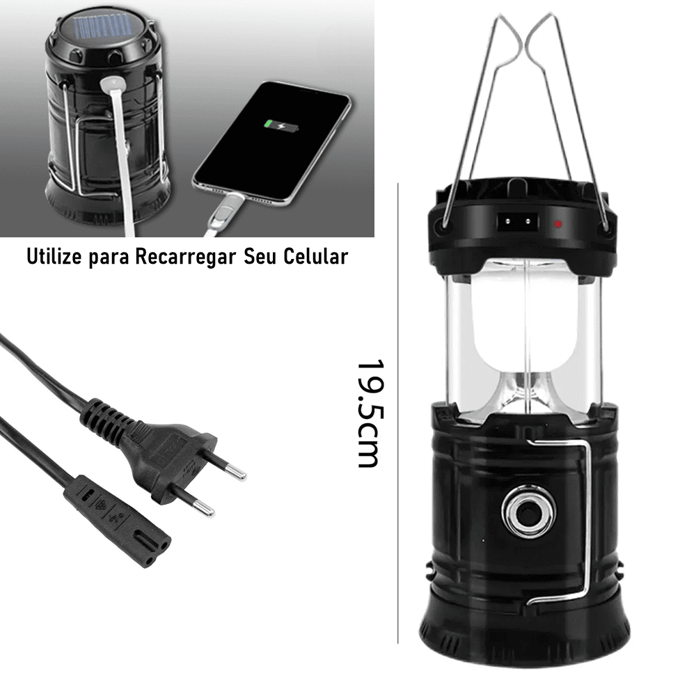 A Luminária Solar é multifuncional, possui uma lanterna e um lampião embutidos. Pode ser carregada via solar ou através da eletricidade (bivolt). Ideal para acampamentos, pescaria, emergências durante a noite, trabalhar no computador ou ler separadamente sem incomodar os outros.