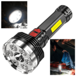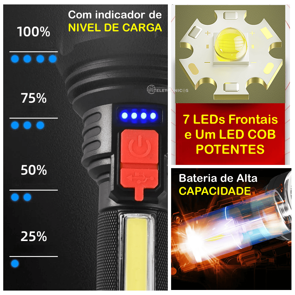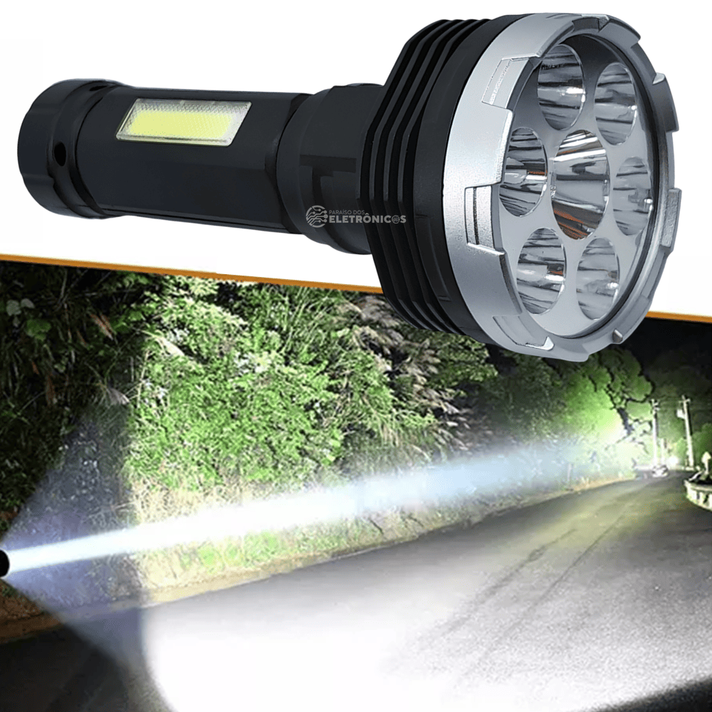 Equipada com 7 LEDs e uma lâmpada COB de luz lateral, oferece iluminação potente e ampla. Seu design compacto e leve a torna perfeita para acampamento, trilhas e situações de emergência. Além disso, é fornecida com baterias recarregáveis, garantindo economia e sustentabilidade.
