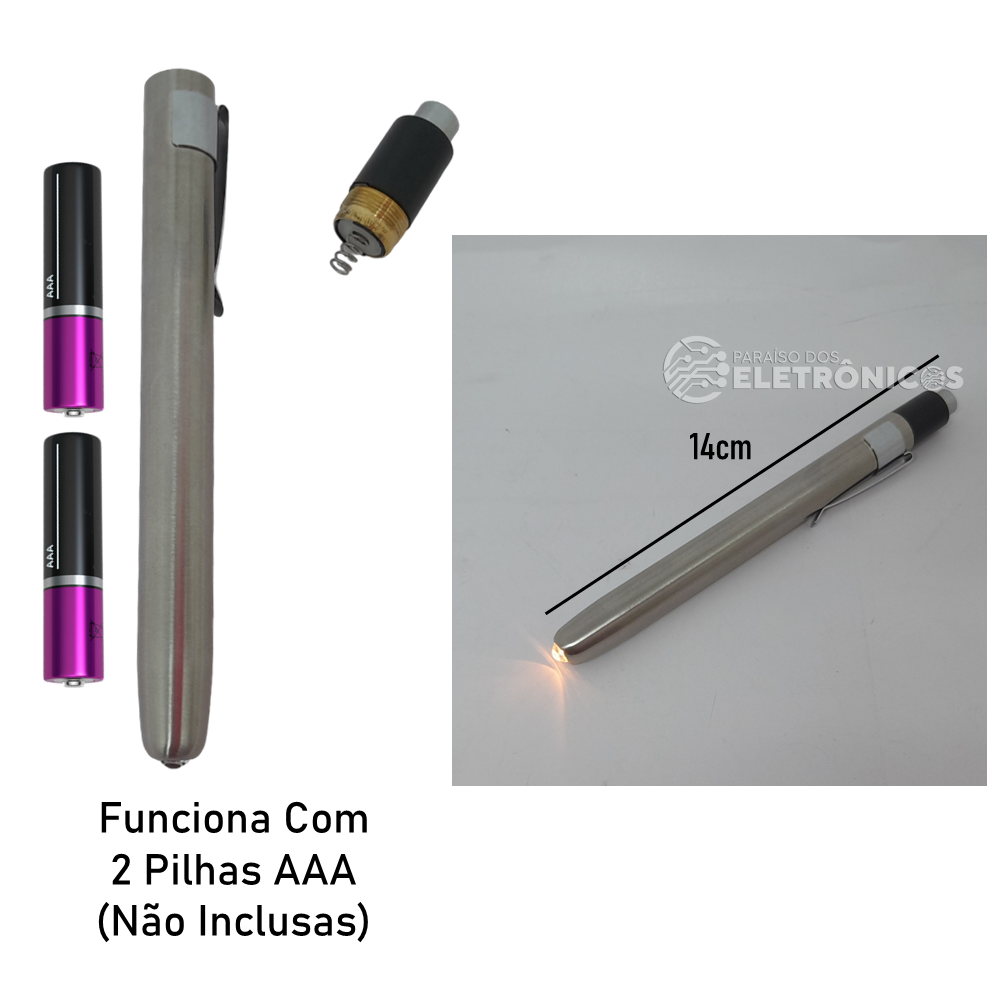 A mesma conta com luz led, proporcionando maior durabilidade das pilhas, gerando uma grande economia de energia. Funciona com 2 pilhas AAA (não inclusas) Vantagens da lanterna clínica: Peça leve, Produto econômico, Contém conveniente clipe de bolso, Não é necessário ficar pressionando o botão.