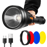 Essa lanterna com lâmpada de LED P50 super brilhante mais econômica, tem maior autonomia de iluminação. Além do beneficio de trocar de lentes sendo elas transparente, azul, vermelha, azul e amarela. Está procurando uma lanterna com qualidade e potência? Essa é para você mesmo! A lanterna LED multifuncional ideal para campings, piquenique, uso doméstico diário possui 5 funções de iluminação sendo elas Luz forte, luz media, luz fraca, luz piscando e SOS , trazendo um design completo, inovador e resistente a respingos de água, além de ser recarregável. A lanterna tem Power Bank embutida! Super Potente e prático, garante seu celular carregado em qualquer lugar, funciona em TODOS os modelos de celular.