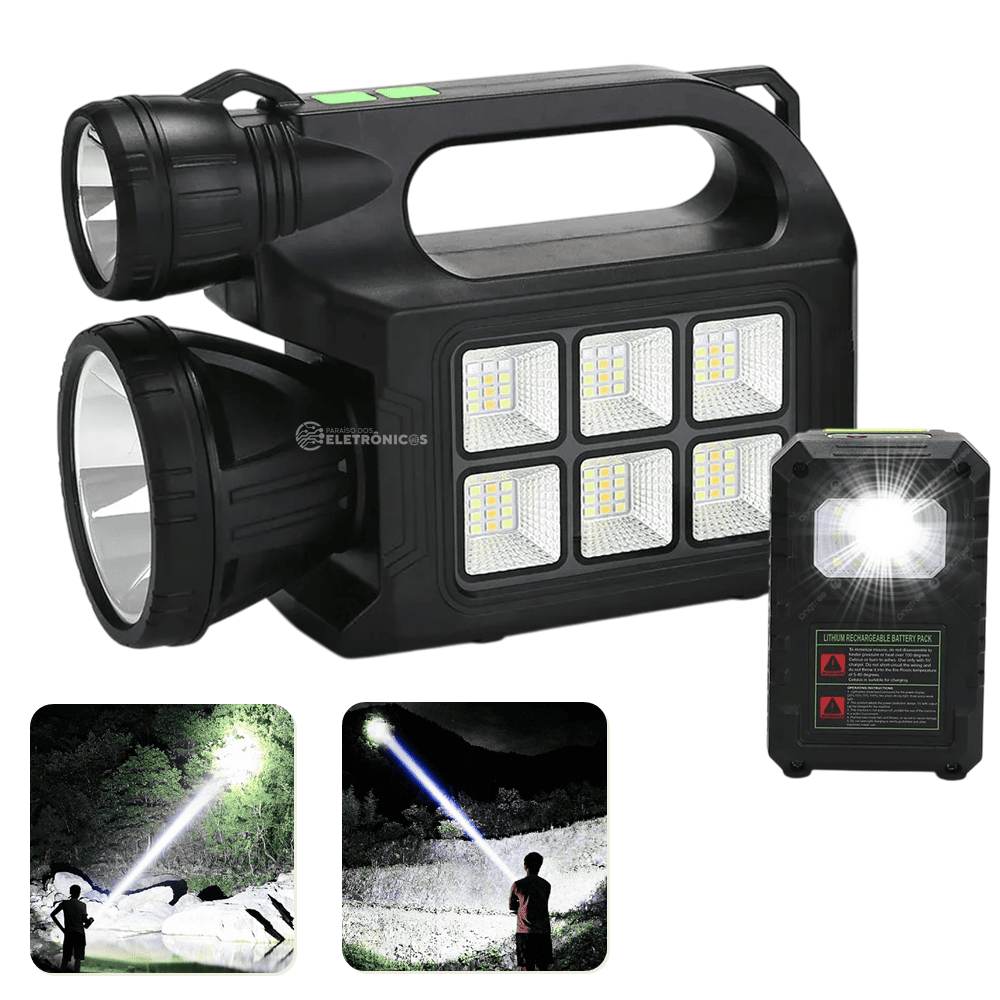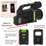 Alimentado por uma potente bateria recarregável de 6000mAh, possui uma potencia de 30w de iluminação constituído por 72 LEDs essa lanterna é indispensável durante apagões, viagens noturnas, acampamentos e eventos ao ar livre. Equipado com LEDs potentes e uma bateria de longa duração, o sistema oferece luz constante e confiável, a bateria permite o carregamento de dispositivos móveis como celulares por meio de suas entradas USB. Não acompanha aparelho celular.