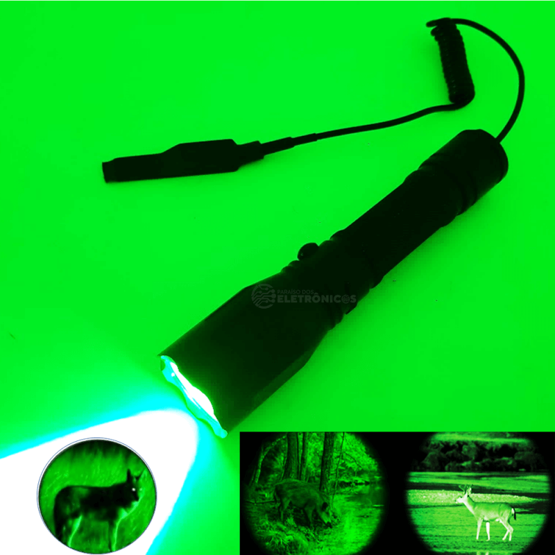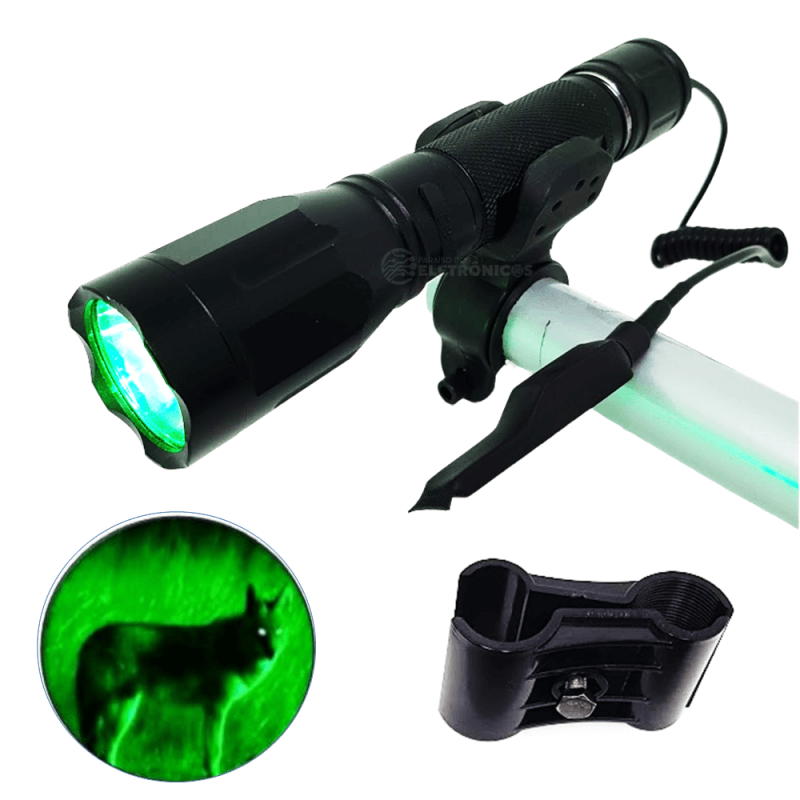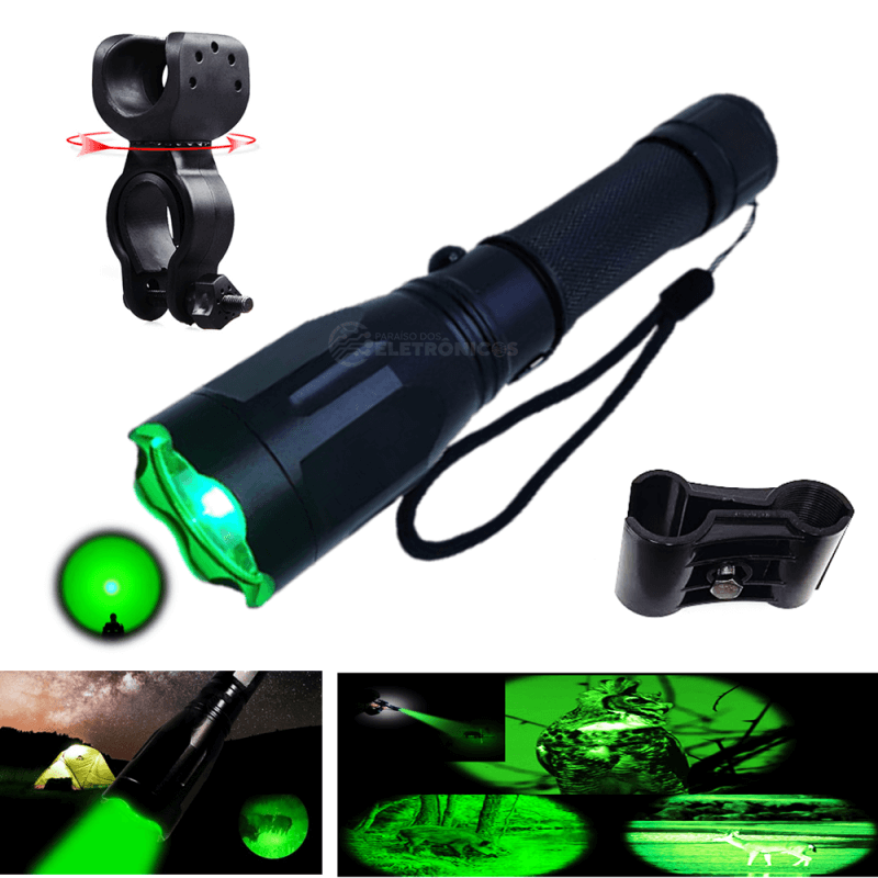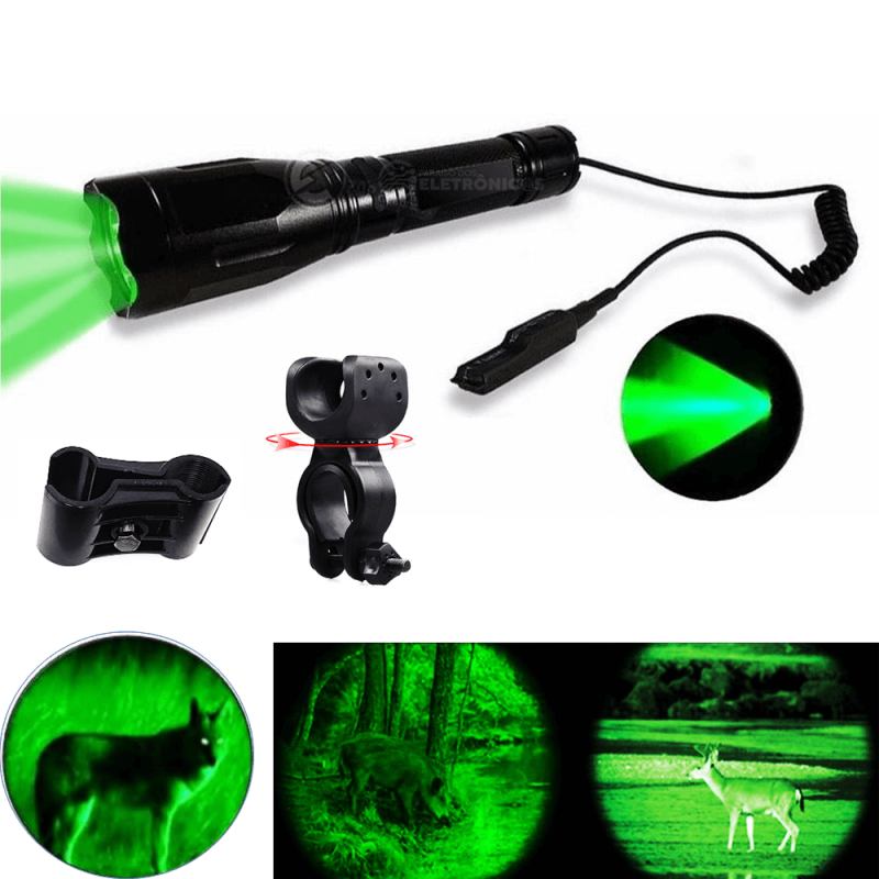 Lanterna diferenciada, pois possui LED CREE 3.610000 lumens super potente na cor verde, além de possuir opção de usá-la com botão de acionamento remoto. A luz verde é invisível para o animal, além de deixar seus olhos brilhantes, sendo facilmente notados até em matas fechadas. por isso a lanterna de luz verde é indispensável para uma boa caçada!