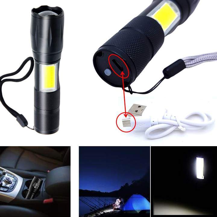 Lanterna Tática T6 Foco Luz LED Azul Recarregável USB + Luz E Pisca Lateral Para Emergencial 128000w