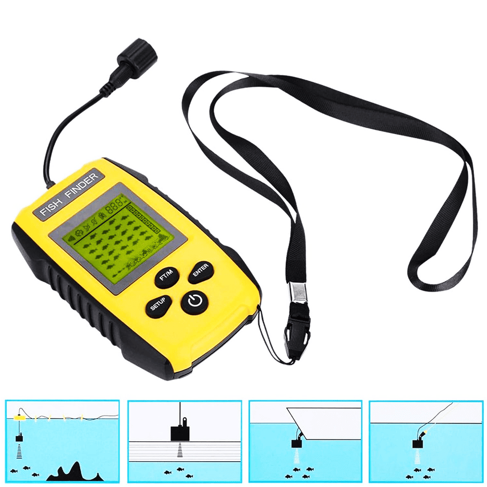 Vem com uma alça de pescoço, fácil de pendurar no pescoço, conveniente para você usar. Energia, configuração, entre e FT/M, 4 botões no localizador de peixes, fácil de usar e escolher o modo. Funciona com 4 pilhas AAA (não acompanham).