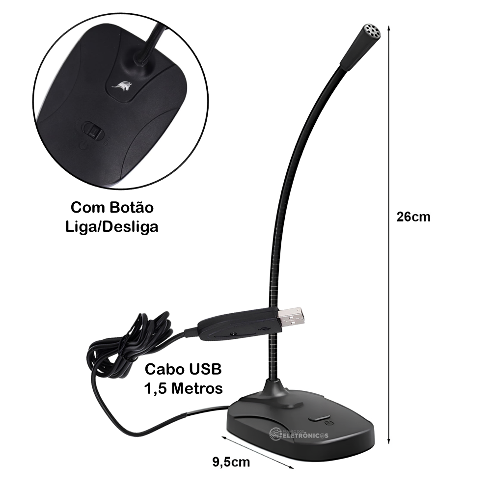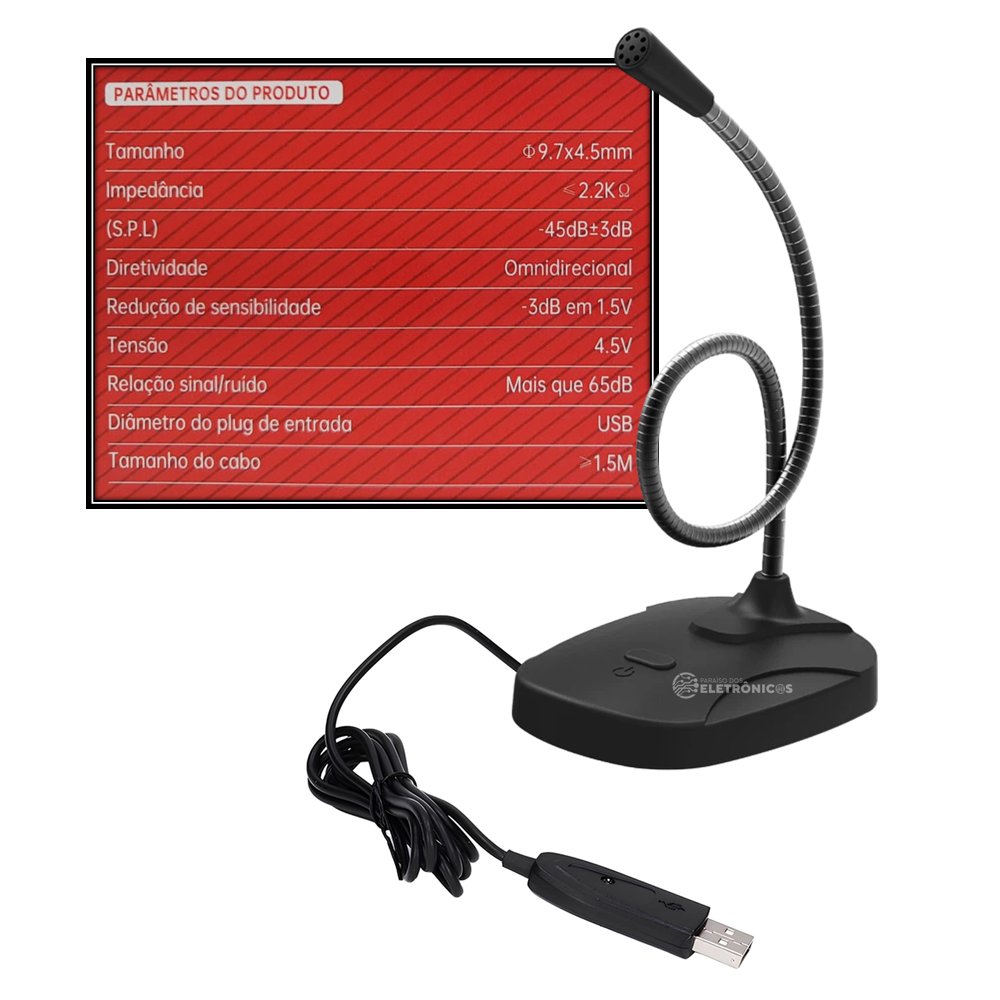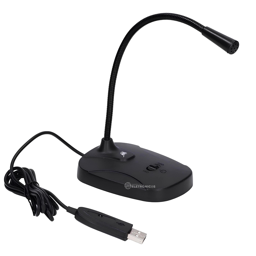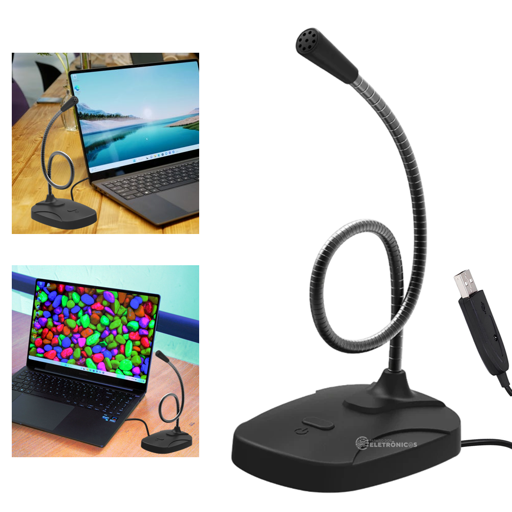 Microfone Omnidirecional USB De Mesa Com Botão On/off Haste Flexível