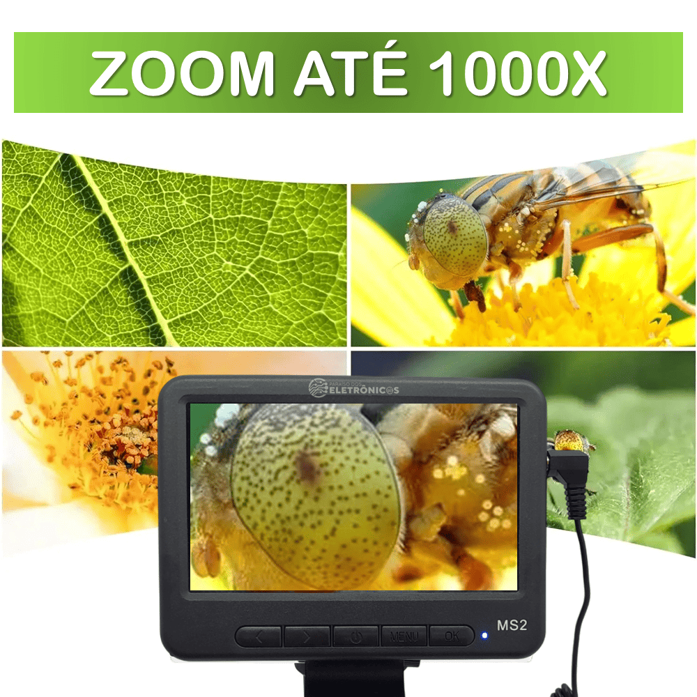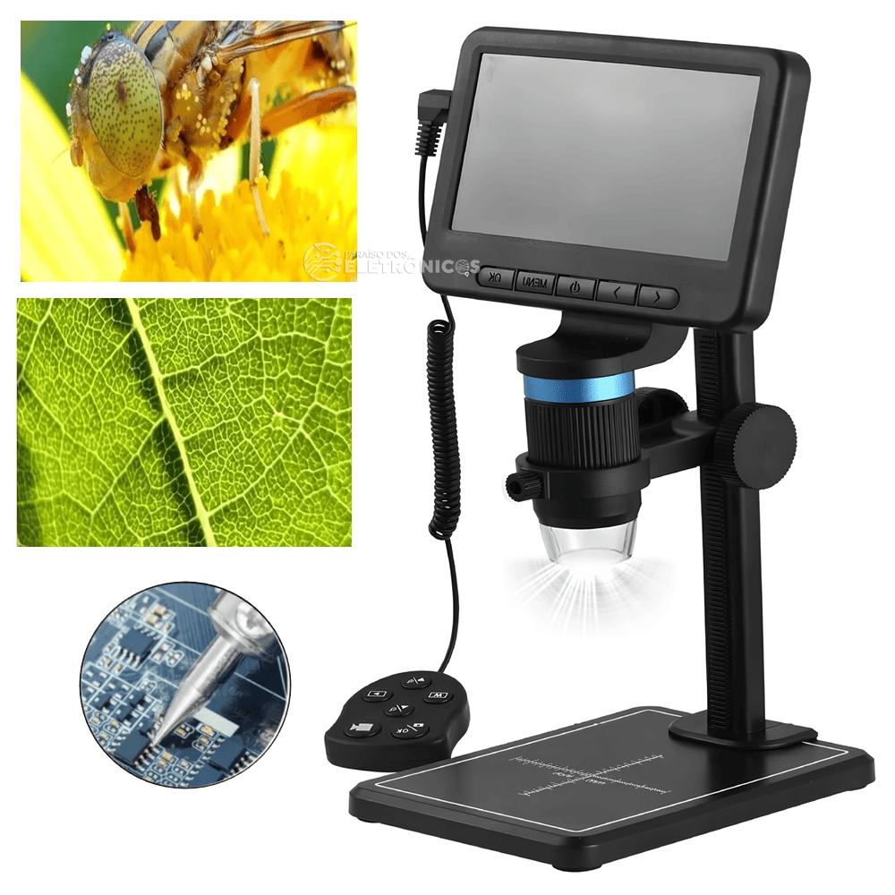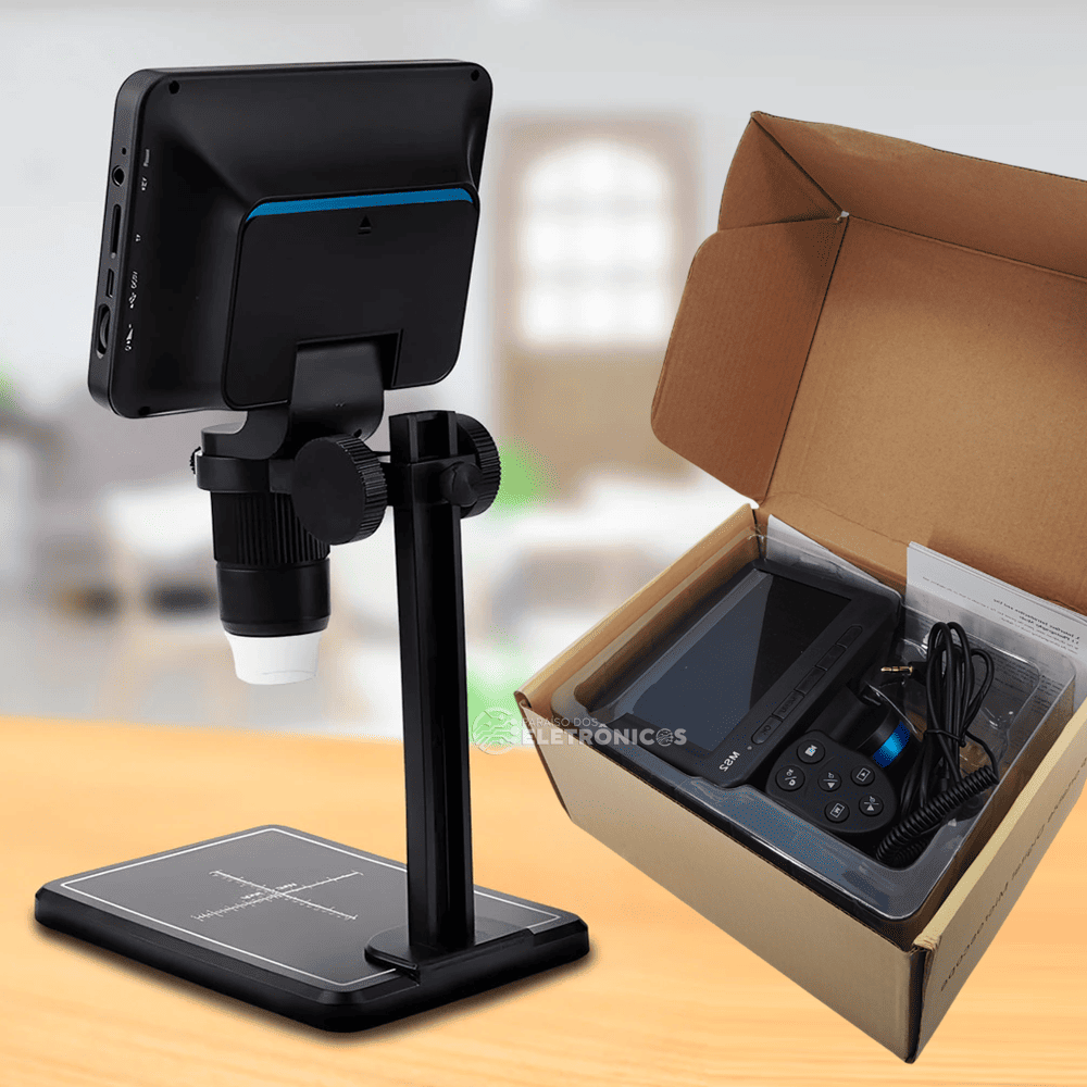 Descubra uma nova dimensão de observação com o nosso Microscópio Digital Portátil. Com uma tela de 5 polegadas e zoom de até 1000x, este microscópio oferece uma visualização maior, mais clara e intuitiva em comparação com microscópios tradicionais.