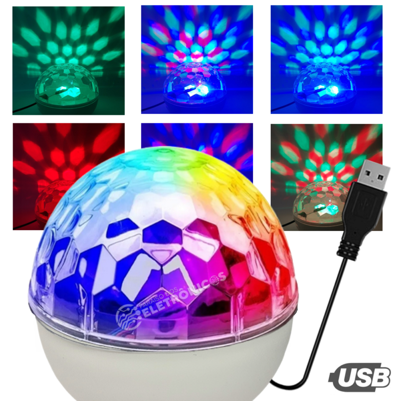 Multi luzes de discoteca, luzes de festa: vermelho, verde, azul, vermelho/verde, vermelho/azul, verde/azul e RGB. Conta com lindo efeito rotativo e brilhante. Como mistura de cores sua festa vai ficar mais animada e divertida. Pode ser ligado em qualquer tomada USB de 5v, como por exemplo carregadores de celulares, Power Banks, Tomadas USB, etc.