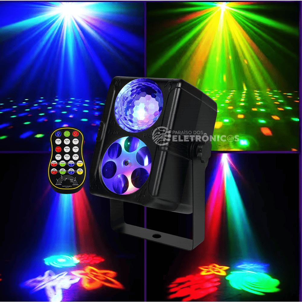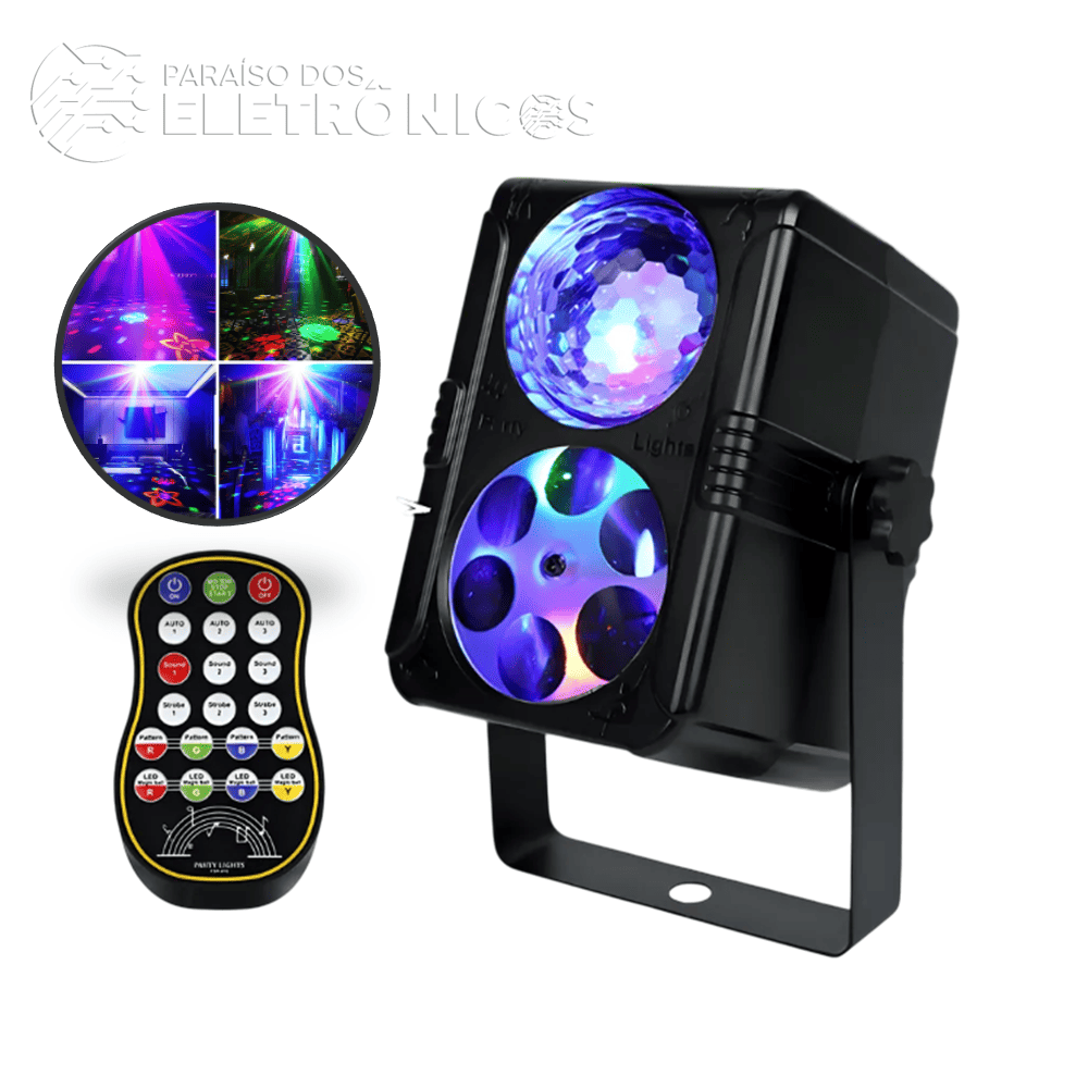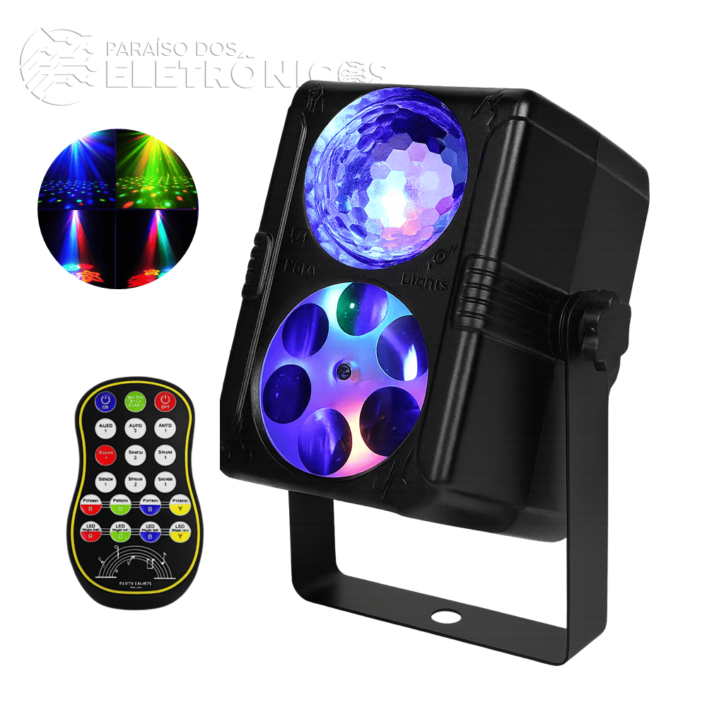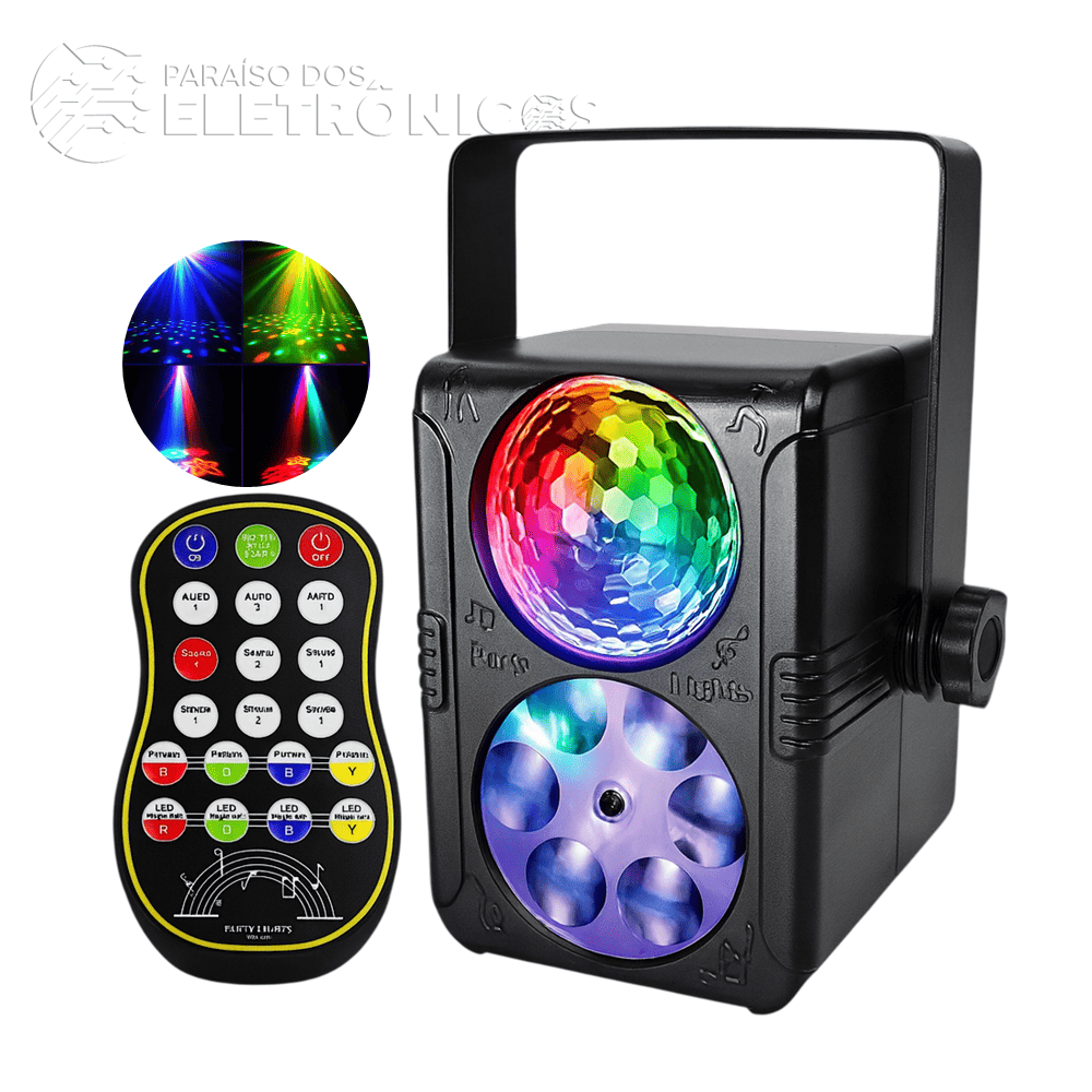 Tenha controle total das luzes sem sair do lugar. Com o controle remoto você pode ligar/desligar, alternar entre os modos de iluminação, ajustar a velocidade do motor, selecionar cores, ativar efeitos de flash e personalizar toda a experiência luminosa com praticidade.