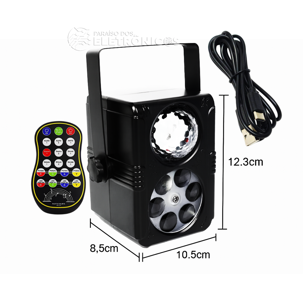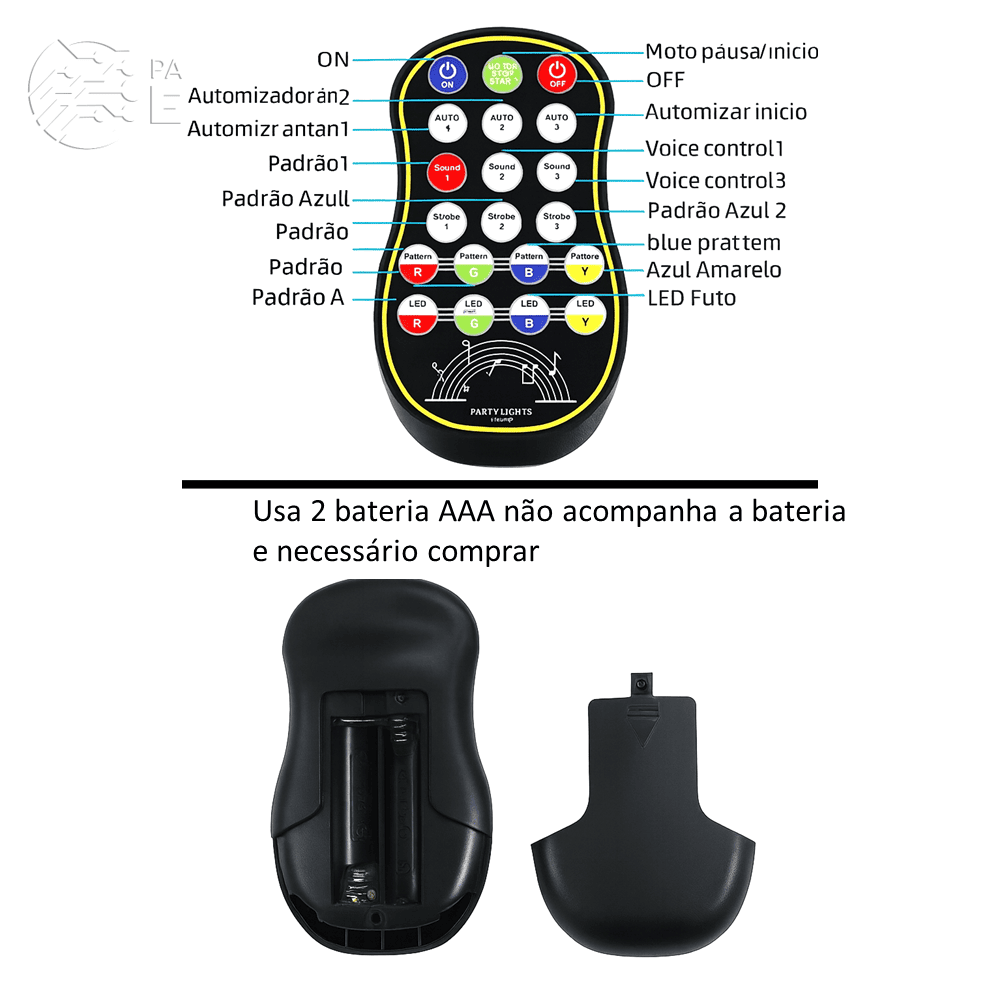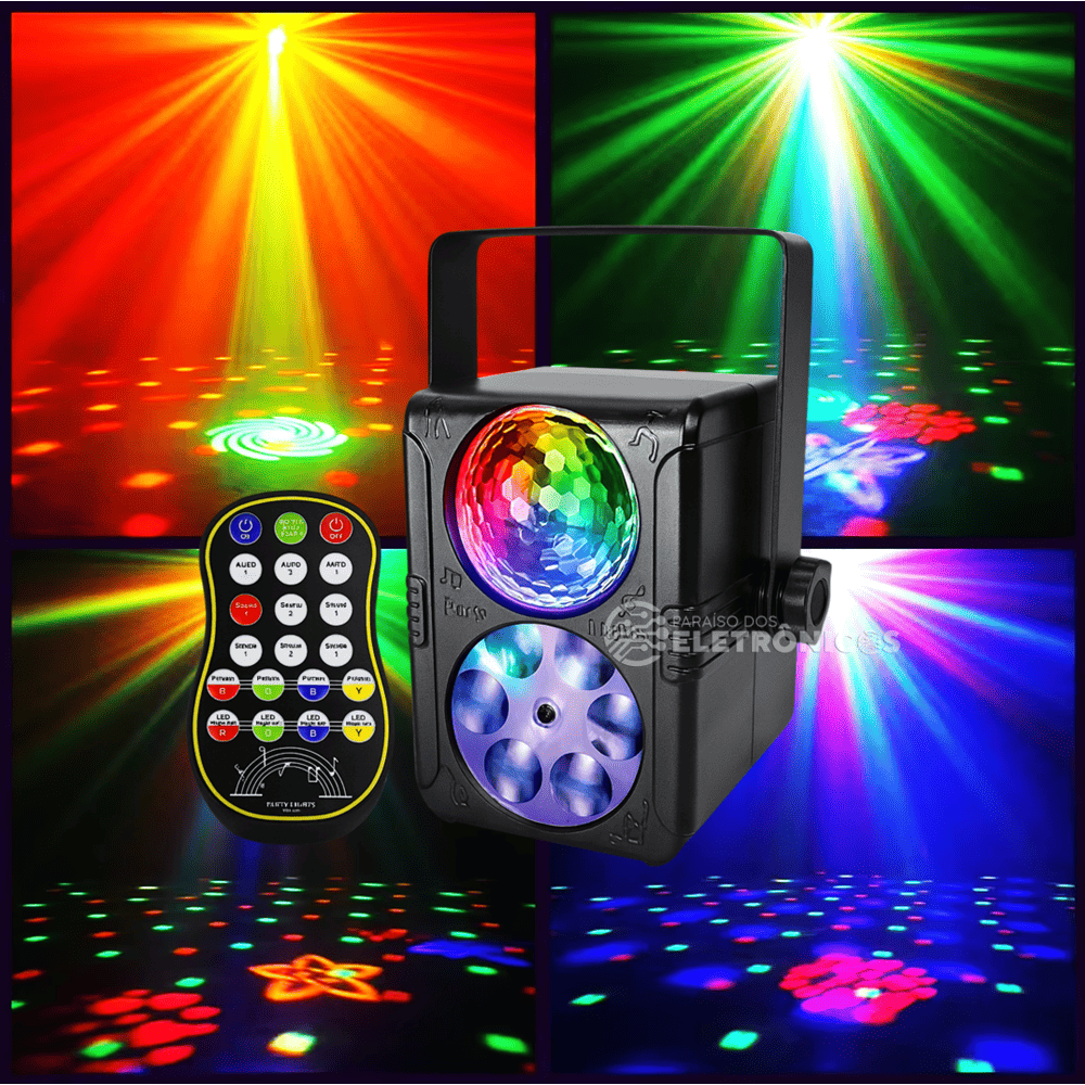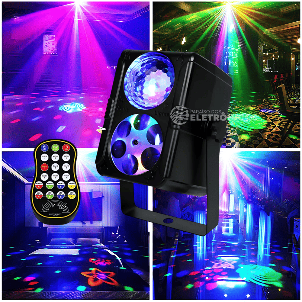 Tenha controle total das luzes sem sair do lugar. Com o controle remoto você pode ligar/desligar, alternar entre os modos de iluminação, ajustar a velocidade do motor, selecionar cores, ativar efeitos de flash e personalizar toda a experiência luminosa com praticidade.
