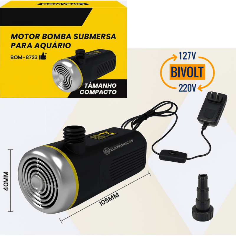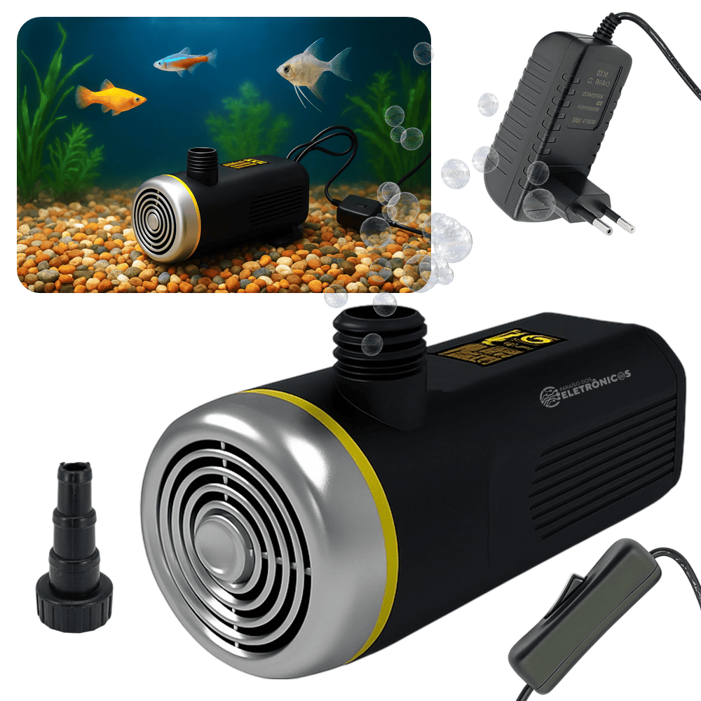 Indispensável para uso em fontes de decorações, bebedouros, aquários, entre outros. Pode ser utilizado por fora da água ou dentro de aquários. Pode ser utilizada na água doce e salgada, possui fluxo de água ajustável, tem baixo consumo de energia, conta com ventosas para fixação, desmontável, fácil de limpar e silenciosa. Possui botão liga/desliga e fonte alimentação bivolt.