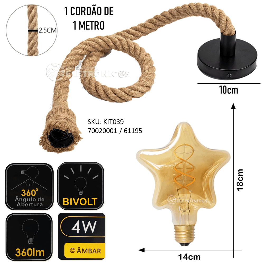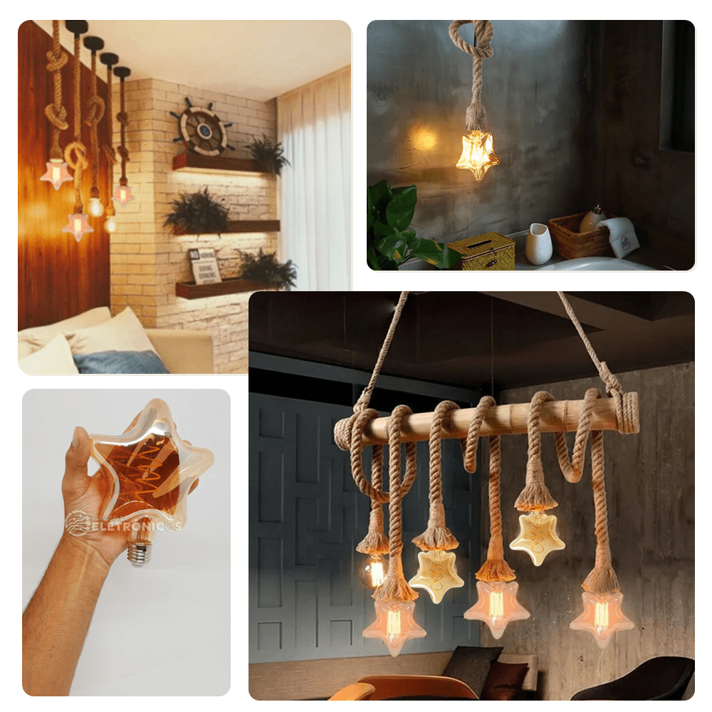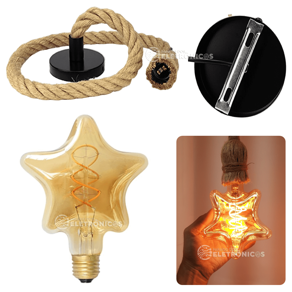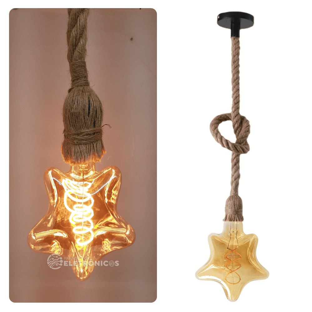 O Kit Corda Pendente Retro Rústico com lâmpada LED em formato Estrela, traz estilo, beleza e aconchego para o ambiente. Ideal para restaurantes, bares, salas de jantares, cozinhas, armazéns ou onde preferir, deixando seu ambiente mais elegante.