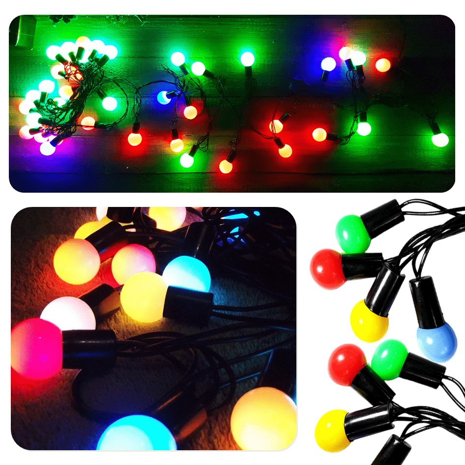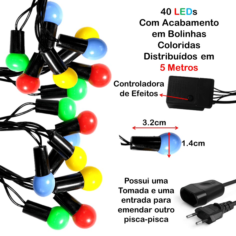 Quantidade de LEDs: 40 LED´s no formato de bolinhas lâmpadas coloridas.