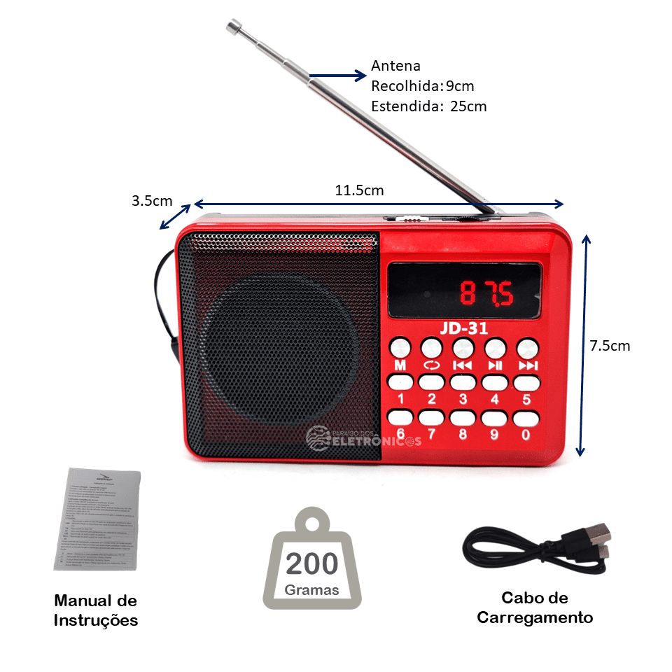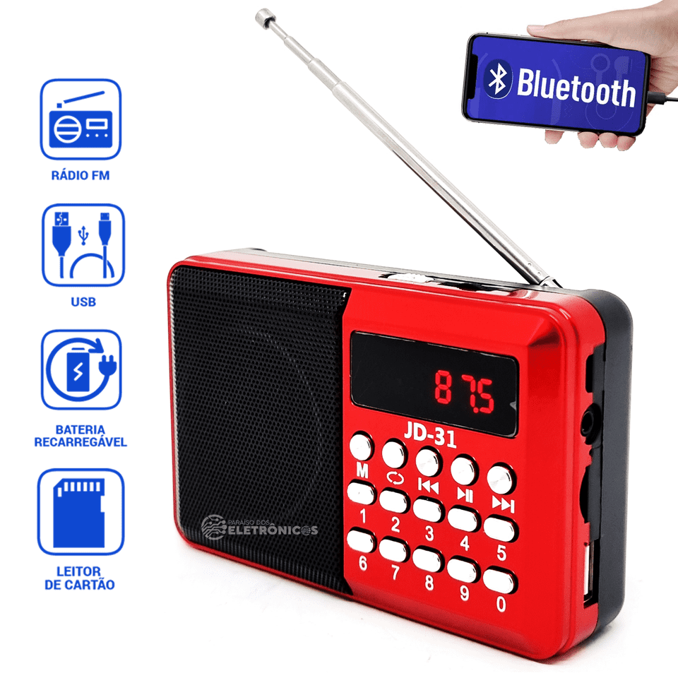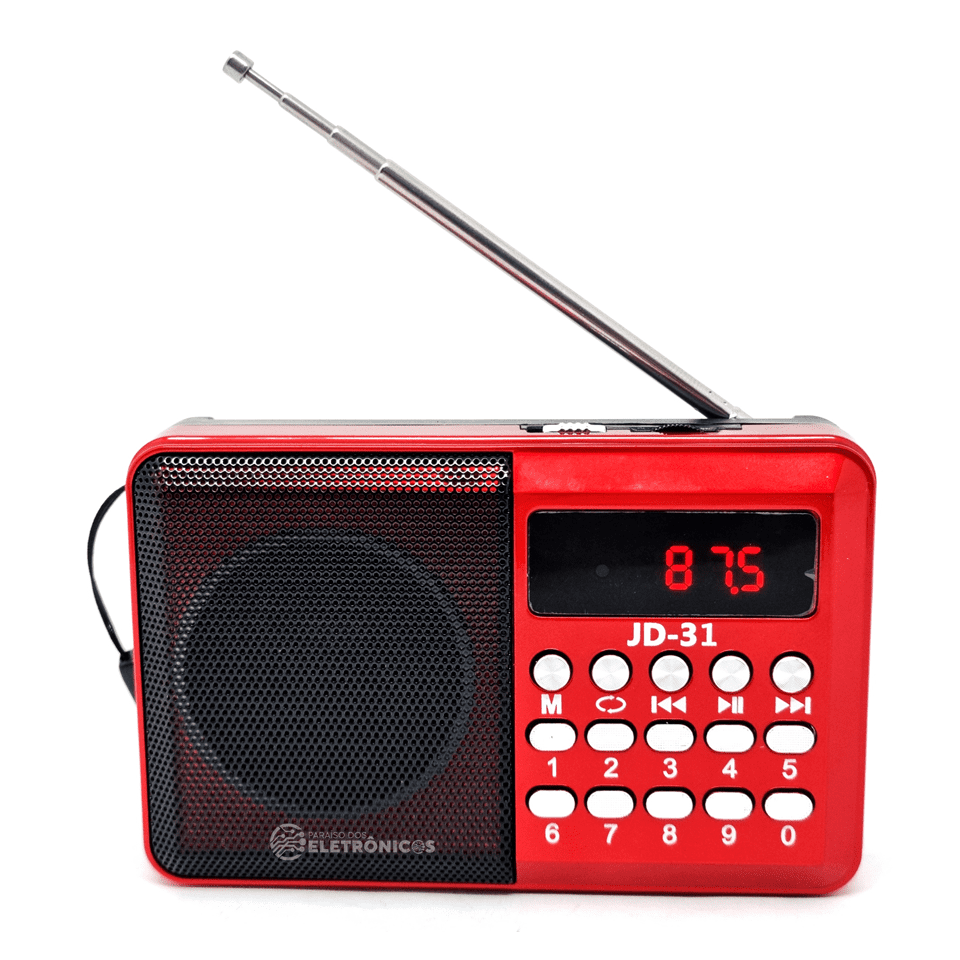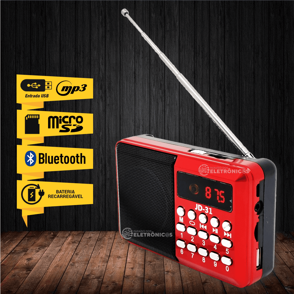 Rádio Portátil Digital JD-31 possui painel frontal com botões de comando apara acessar as funções com ótima qualidade de som com conexão USB, bateria recarregável de ótima recepção. Banda FM, Bluetooth, saída auxiliar para fone de ouvido P2, entradas USB/Micro SD, alimentação através de 1 bateria (inclusa) recarregável por USB (cabo micro-USB acompanha o produto).