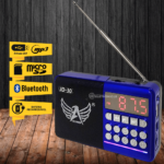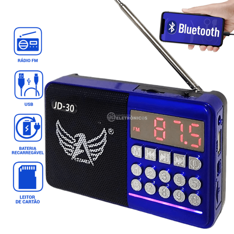 Rádio Portátil JD30 possui painel frontal com botões de comando apara acessar as funções com ótima qualidade de som com conexão USB, bateria recarregável de ótima recepção. Banda FM, Bluetooth, saída auxiliar para fone de ouvido P2, entradas USB/Micro SD, alimentação através de 1 bateria (inclusa) recarregável por USB (cabo micro-USB acompanha o produto).
