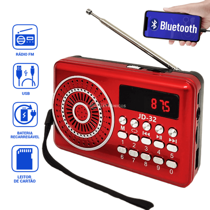 Rádio Portátil JD-32 possui painel frontal com botões de comando apara acessar as funções com ótima qualidade de som com conexão USB, bateria recarregável de ótima recepção. Banda FM, Bluetooth, saída auxiliar para fone de ouvido P2, entradas USB/Micro SD, alimentação através de 1 bateria (inclusa) recarregável por USB (cabo micro-USB acompanha o produto).
