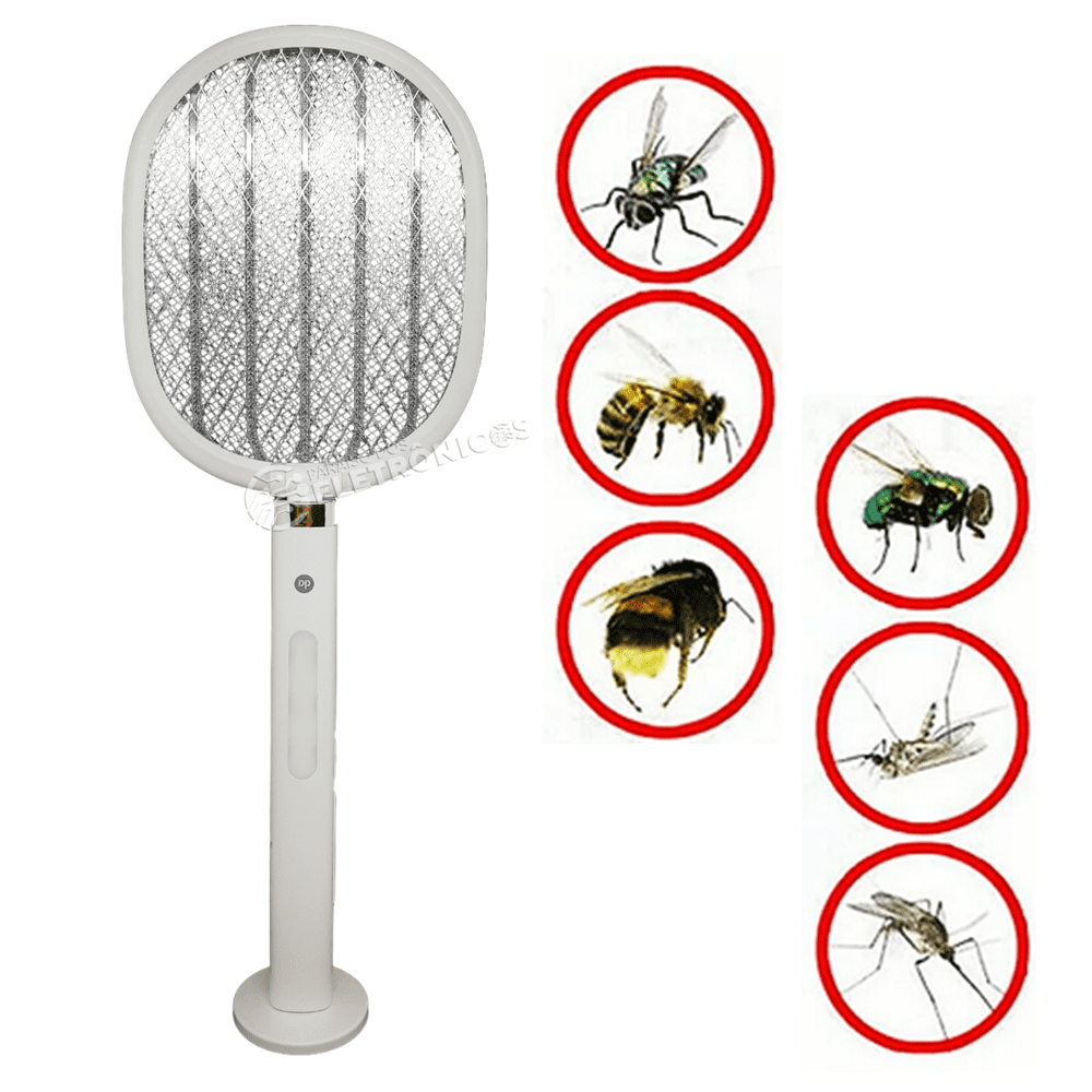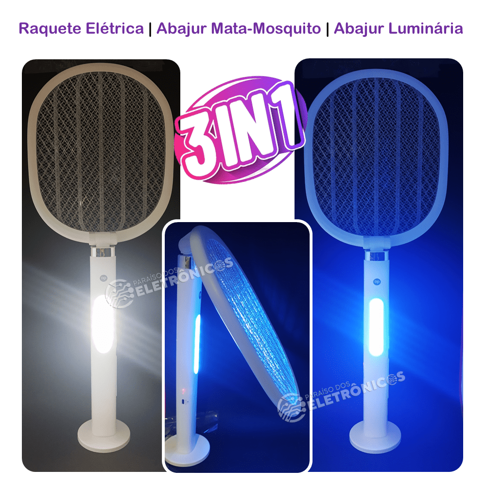 Raquete 3 IN 1 é Recarregável com LED UV atrair mosquitos e outro insetos facilmente. Possui a função abajur mata mosquito e abajur comum. Pode ser utilizada de forma convencional (raquete) ou sobre algum movél em forma de abajur, dessa forma você terá uma noite de sono livre de mosquitos e pernilongos. Trabalha silenciosamente. Além disso, a Raquete possui um design dobrável , permitindo que você o ajuste para economizar espaço e facilite o armazenamento quando não estiver em uso. Possui controle Automático exterminando os insetos sem precisar manusear o produto, carregamento USB (acompanha cabo USB-c), bateria de grande autonomia, rede de segurança de três camadas, evitar toque acidental, mais seguro de usar. A raquete conta com um suporte para manter a mesma sempre pronta para o uso matando os insetos automaticamente.