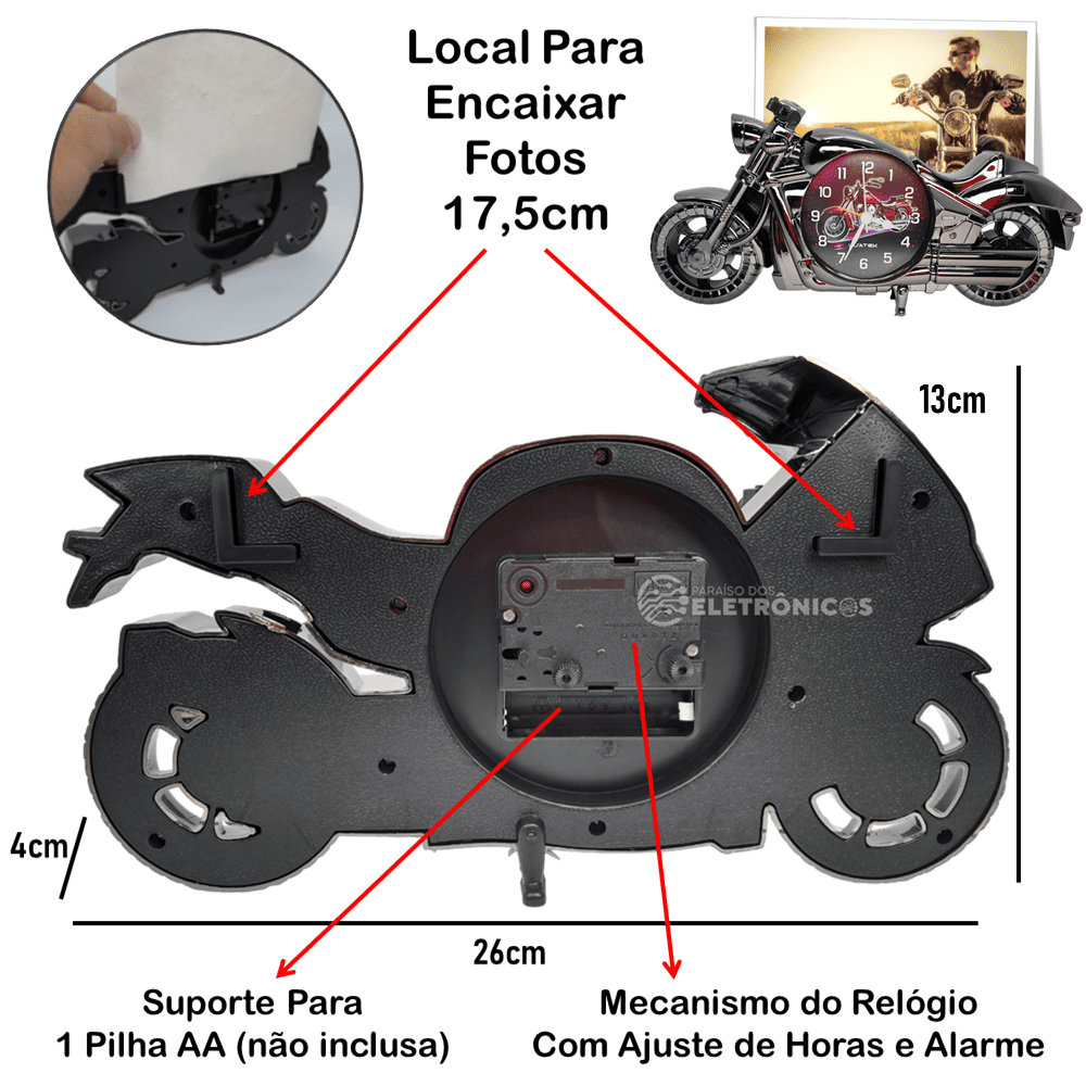 Um relógio despertador decorativo no formato de moto. Ideal para quem buscar decorar um ambiente interno de forma moderna e aventureira! Enfeite mesas, salas, quartos, escritórios entre outros ambientes. Possui suporte para fotografia, tornando um porta retrato. Funciona com 1 pilha AA (não inclusa).