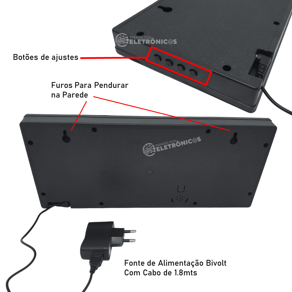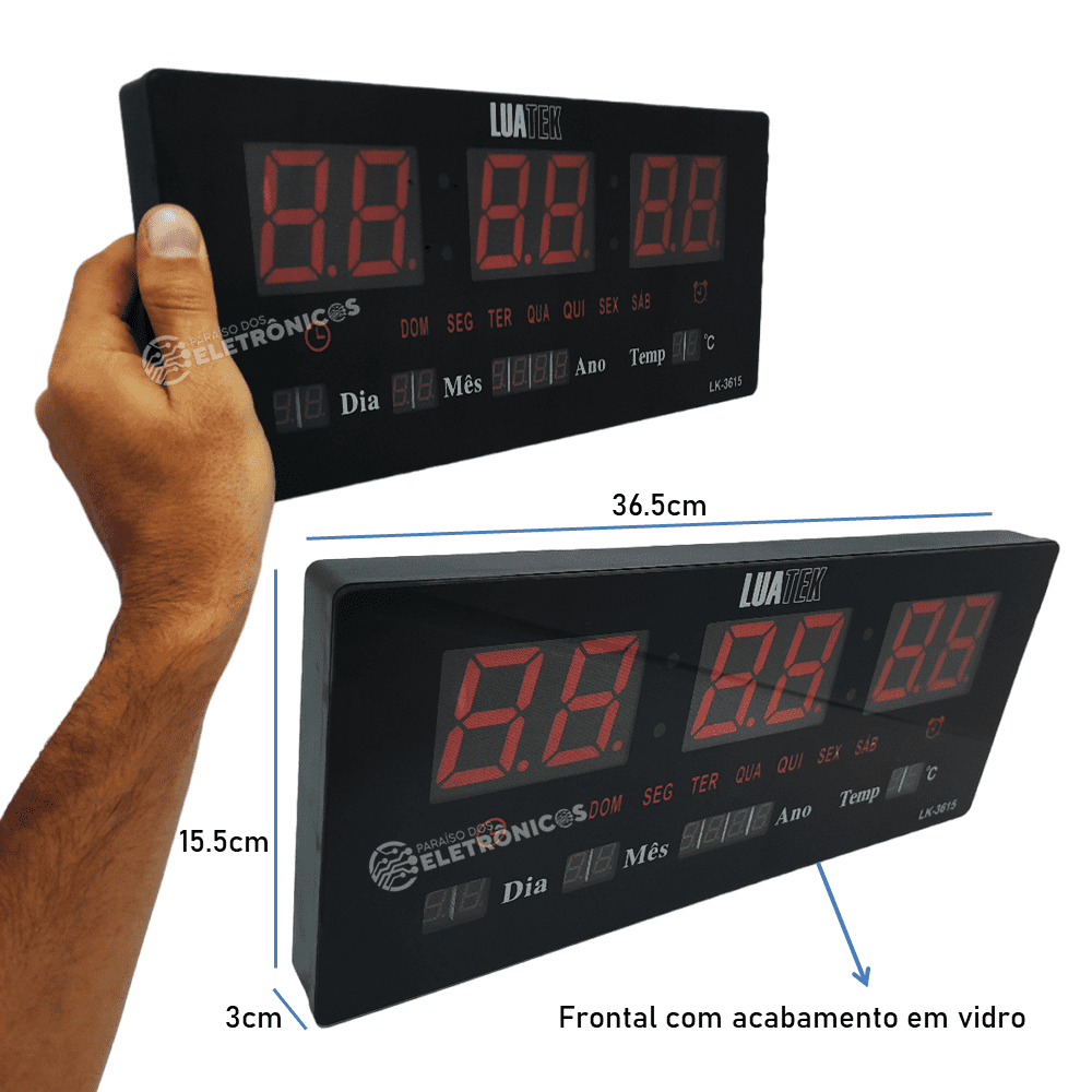 Além da função relógio com alarme, que é no formato 12 ou 24 horas (AM / PM), também possui calendário com a data do dia, mês e ano, além de indicar o dia da semana, um sensor termômetro em graus Celsius °C, completa o produto. Displays com alta performance para fácil visualização nos ambientes. Produto para uso interno. Possui furos na parte de trás para pendurar na parede.