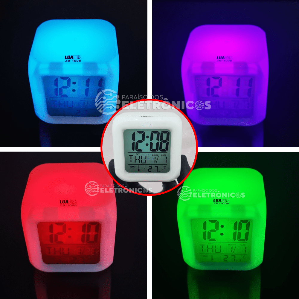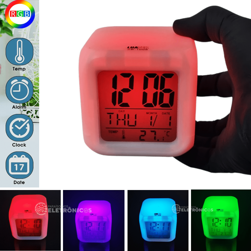 Possui mudança automática de 7 cores (LED) diferentes e você pode desligar quando quiser, marca a hora; data; semana; temperatura e também funciona como luminária.