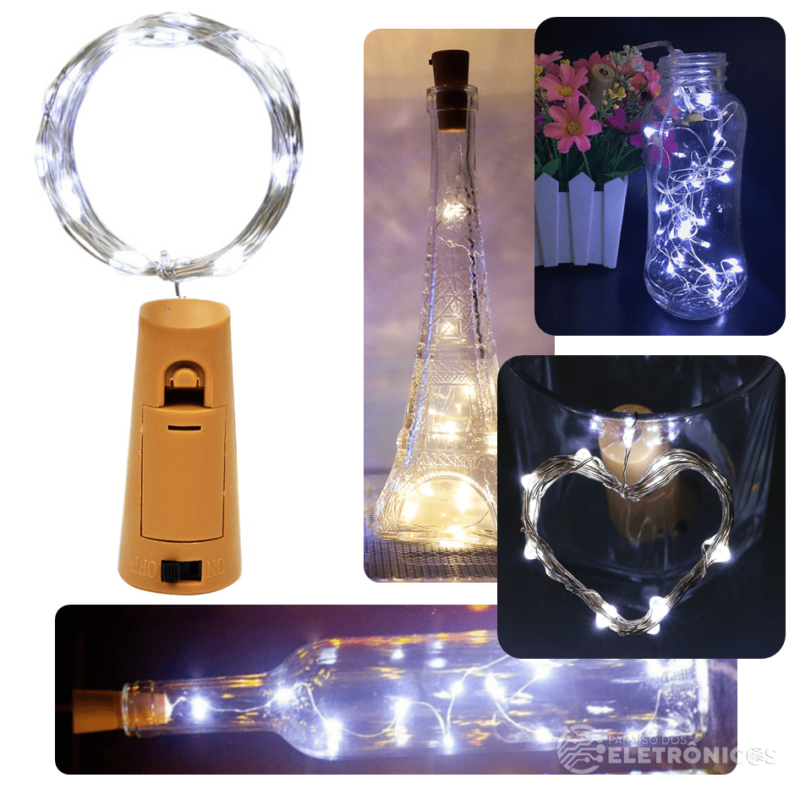 A rolha com fio de LED possui uma corda fina feita de fio de cobre flexível, onde possui a sequência de 20 mini luzes de LEDs na cor BRANCO-FRIO e, que podem ser usadas da forma que desejar.
