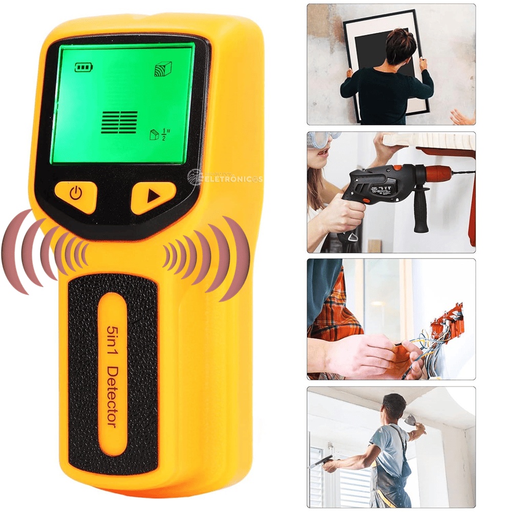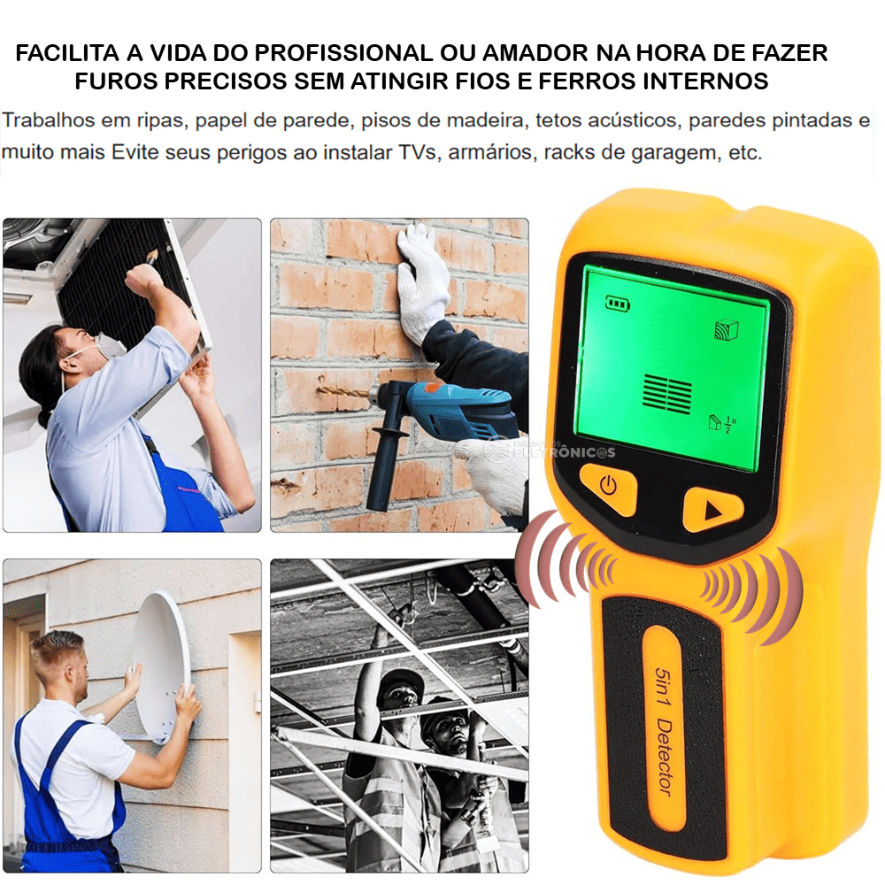 USOS: O localizador eletrônico 5 em 1 localiza rapidamente fios de madeira, metal e AC nas paredes, pisos e tetos de sua casa. Funciona em ripas, papel de parede, pisos de madeira, tetos acústicos, paredes pintadas e muito mais.