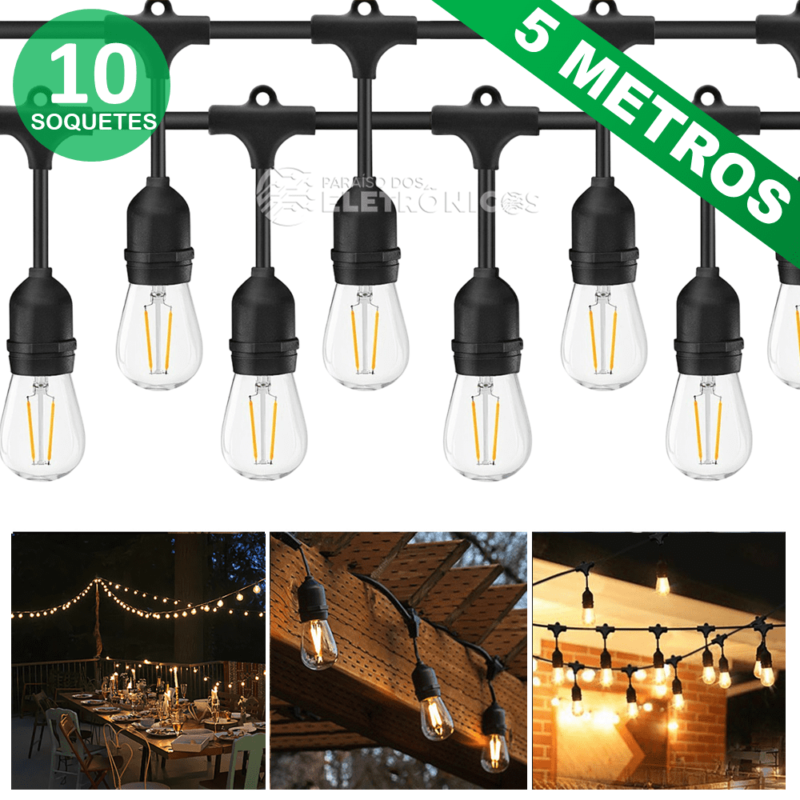 Composta por uma série de lâmpadas suspensas em um fio, é ideal para criar um ambiente aconchegante em varandas, jardins, quartos e espaços de festa.
