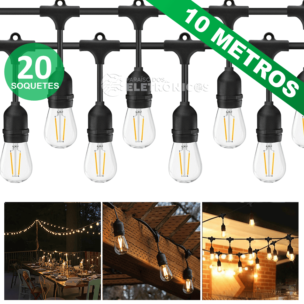 Composta por uma série de lâmpadas suspensas em um fio, é ideal para criar um ambiente aconchegante em varandas, jardins, quartos e espaços de festa.
