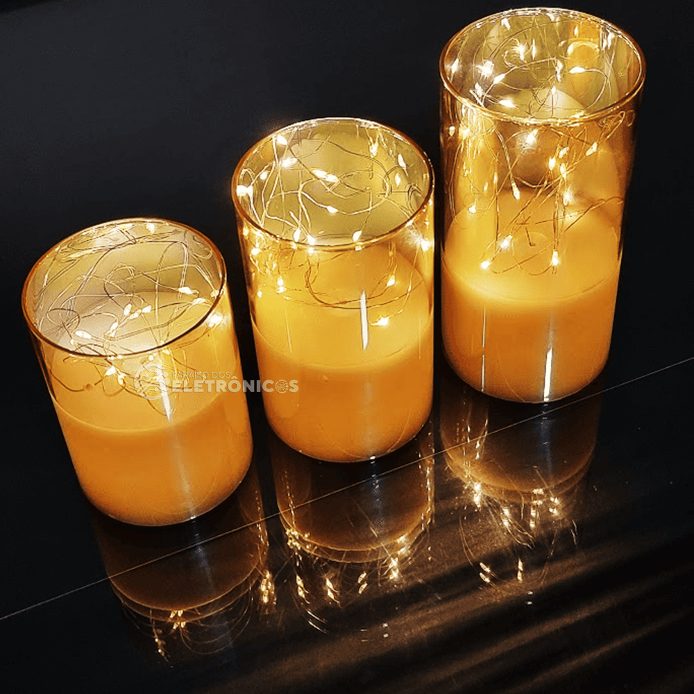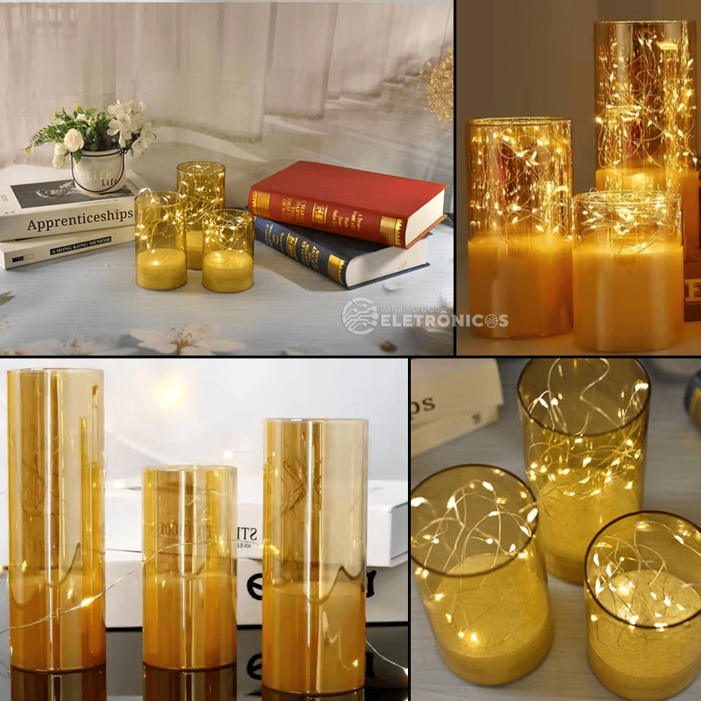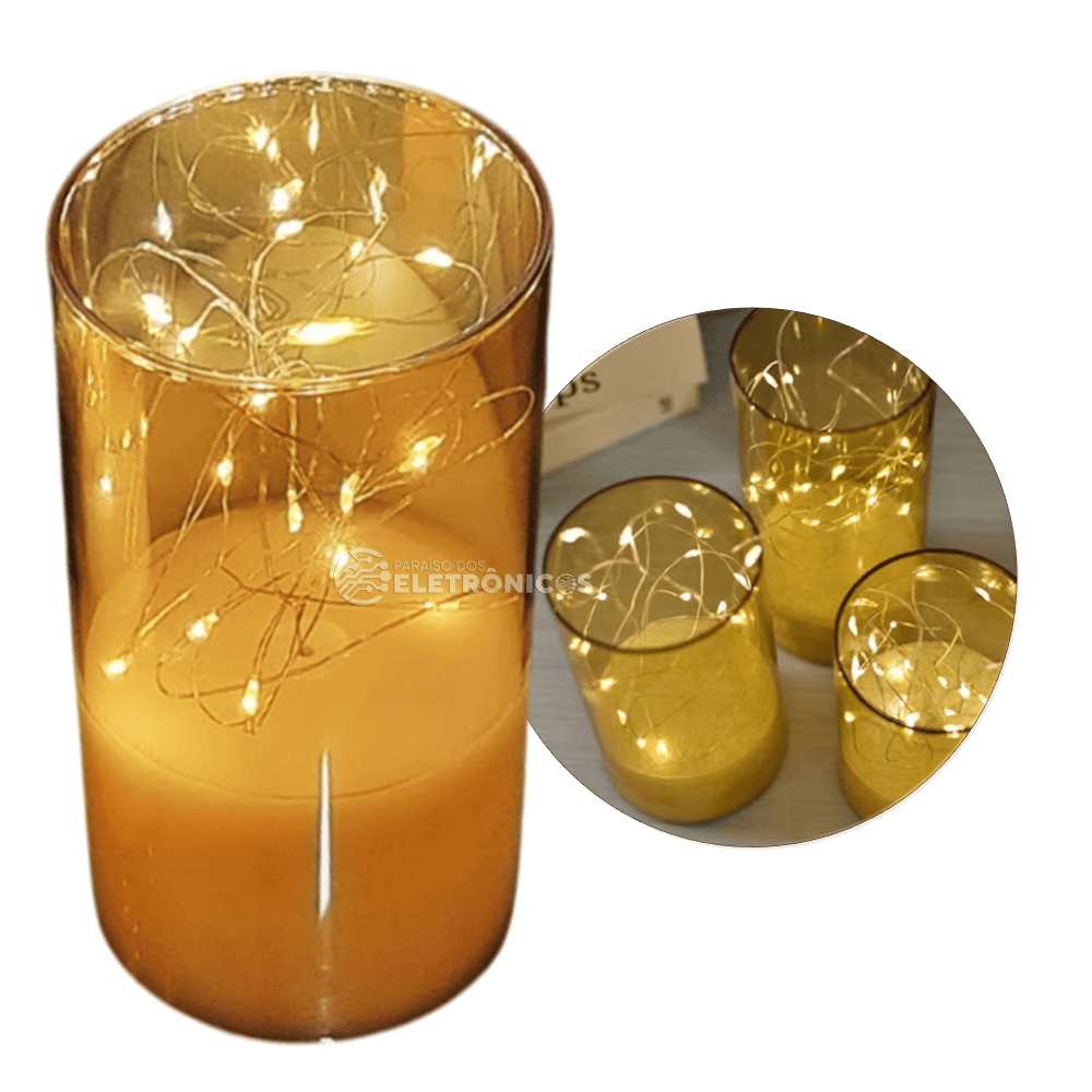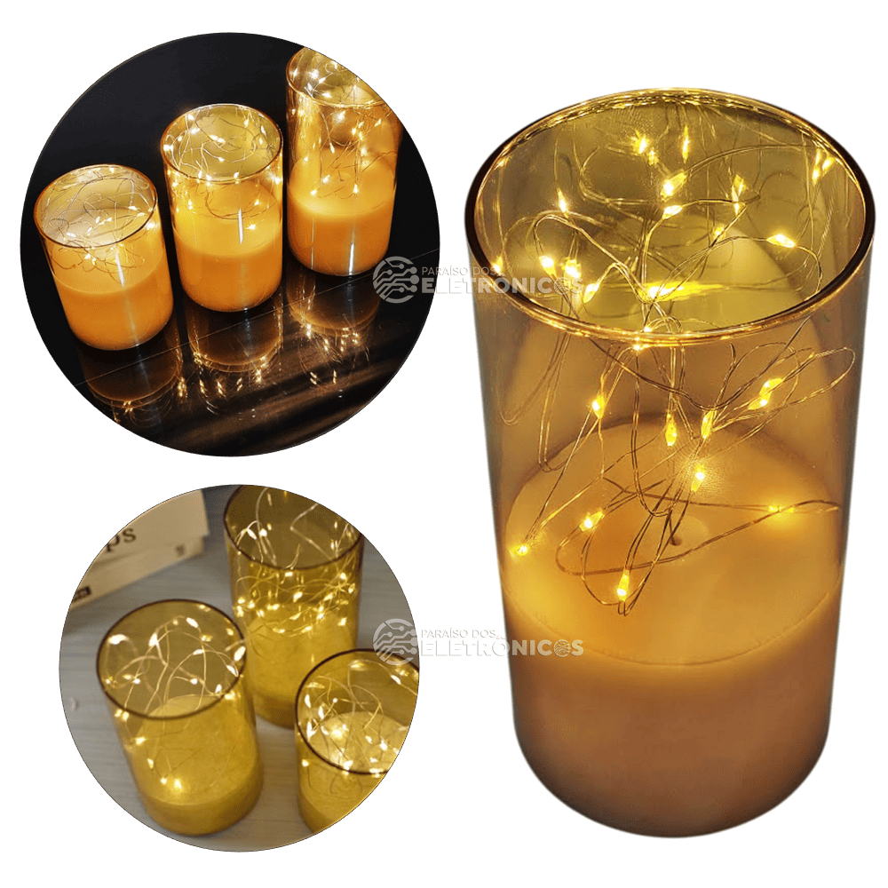 Transforme o ambiente da sua casa ou escritório com esta elegante vela decorativa com iluminação com fio fada de LED. Ideal para quem aprecia uma decoração vintage e sofisticada, essas velas criam uma atmosfera acolhedora e charmosa, perfeita para momentos especiais ou como presente criativo em datas comemorativas.