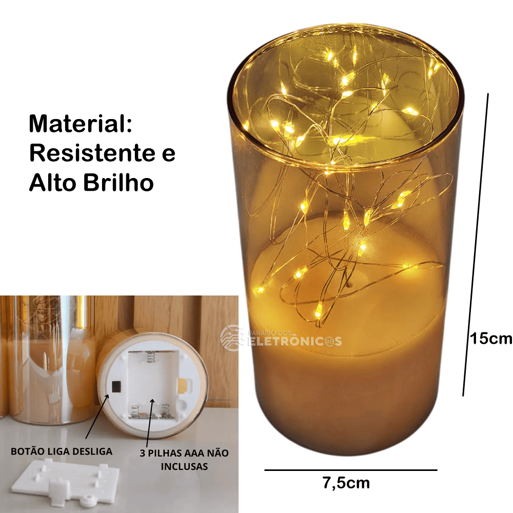 Material: Vidro, parafina decorativa e cordão de luz LED